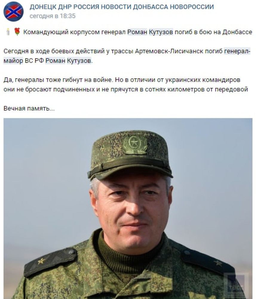 В российских пабликах уточняют, что генерал Кутузов погиб в поселке Николаевка Попаснянского района Луганской области.