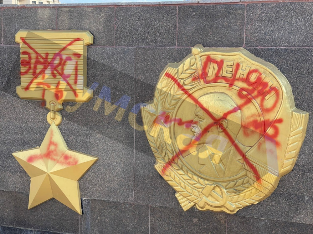 Як передає кореспондент «Думської», на барельєфах у вигляді ордена Леніна та медалі «Золота Зірка» написали червоною фарбою нецензурні слова.