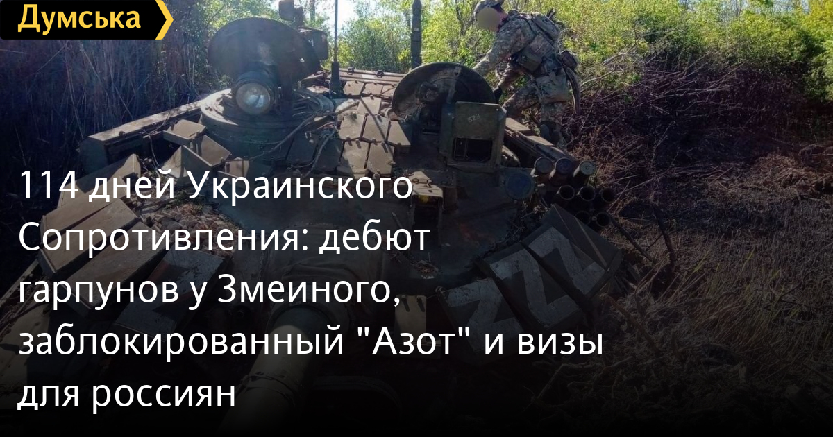 114 дней Украинского Сопротивления: дебют «гарпунов» у Змеиного, заблокированный «Азот» и визы для россиянЗавершаются 114-е сутки героического сопротивления украинского народа полномасштабному вторжению нацистской россии. Главная новость пятницы – уничтожение украинскими защитниками новейшего российского аварийно-спасательного судна «Спасатель Василий Бех» с зенитно-ракетным комплексом «Тор» на борту. Этот большой буксир, напичканный весьма современной электроникой, принимал участие в снабжении оккупационных сил на острове Змеиный. В 3:55 утра судно поразили двумя противокорабельными ракетами «Гарпун». Буксир вспыхнул, и команда была вынуждена его оставить. Из 33 человек, находившихся на борту, выжили 23 – все они получили ранения и травмы разной степени тяжести. Обнаружить судно и зафиксировать момент попадания удалось при помощи беспилотного летательного аппарата «Байрактар». Почему это важно? Силы обороны в очередной раз продемонстрировали свою способность воздействовать на российскую группировку, которая оперирует в северо-западной части Черного моря. Уничтожение еще одной единицы флота страны-агрессора сильно повышает для оккупантов цену присутствия на острове Змеиный, который они превратили в стационарный пост ПВО, связи и радиоэлектронной разведки — и вообще в этом районе акватории. Кроме того, утренний «прилет» по «Беху» показал неэффективность изобретенного российским командованием паллиатива в виде размещения на борту надводных кораблей ЗРК «Тор» (собственная ПВО у большинства единиц довольно слаба): противокорабельные ракеты эти комплексы, похоже, поразить не способны. Будем надеяться, украинские защитники продолжат наносить удары по врагу и, в конце концов, вынудят его убраться восвояси. На суше наиболее ожесточенные боевые действия по-прежнему ведутся в Луганской, Донецкой и Харьковской областях. Враг продолжает штурм Северодонецка, однако окружить или выбить украинские подразделения, закрепившиеся в промзоне, у него никак не получается. При этом противник несет страшные потери и, по некоторым данным, уже утратил до 60% боеготовности. В городе, где остается не менее 10 тысяч гражданских лиц, катастрофическая гуманитарная ситуация – нет света, воды, газа, регулярных поставок продовольствия. В бомбоубежищах, расположенных на территории завода «Азот», укрывается до 500 человек. Эвакуировать их сейчас возможности нет, констатирует областная военная администрация. Северо-западнее Северодонецко-Лисичанской агломерации россияне наступают возле Приволья – с целью выйти на окраины Лисичанска. Южнее попаснянская группировка рф старается окружить наши войска возле Золотого и перерезать трассу Бахмут-Лисичанск в районе Берестового. Похоже, они добились определенных успехов в Камышевахе, но Врубовку взять не смогли: Вооруженные силы нанесли по ним ощутимый контрудар и отбросили на юг. Отмечается некоторое продвижение российских войск в сторону Бахмута от Светлодарска. Они были остановлены у Вершины, но некоторый потенциал для дальнейших наступательных действий сохранили. От наступления на Славянск со стороны Лимана (через Райгородок) враг, похоже, временно отказался и действует в основном силами изюмской группировки, которая, однако, основательно увязла в «треугольнике смерти» Сулиговка-Богор