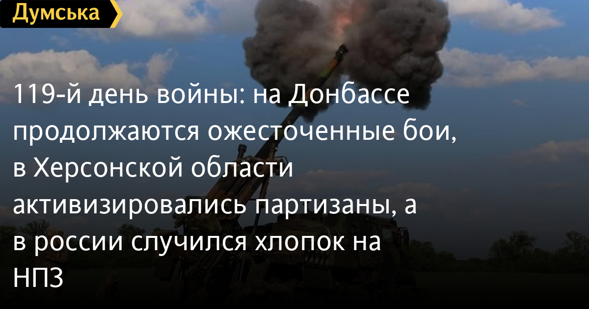 119-й день войны: на Донбассе продолжаются ожесточенные бои, в Херсонской области активизировались партизаны, а в россии случился «хлопок» на НПЗЗавершается 119-й день полномасштабного российского вторжения в Украину. Этот день был успешным для Вооруженных сил Украины, причем проблемы у россиян возникли там, где их вовсе не ждали. Утром украинский дрон-камикадзе (по некоторым данным, их было два) нанес удар по Новошахтинскому нефтеперерабатывающему заводу в Ростовской области. Произошел масштабный взрыв, который как минимум серьезно повредил промышленный объект. Этот завод принадлежит находящемуся за решеткой куму путина и главе запрещенной партии ОПЗЖ Виктору Медведчуку. Поражение крупнейшего на юге россии нефтеперерабатывающего завода может серьезно сказаться на поставках горючего группировке оккупационных войск на Донбассе, в Крыму и Херсонской области. Эксперты предполагают, что для атаки использовался недорогой (стоит в районе 10 тысяч долларов) китайский беспилотник Mugin-5 Pro, который может нести 15-20 килограммов полезной нагрузки. Это примерно равно мощности одной ракеты «Града». В рф традиционно стоит вой на болотах, требования «закрыть небо» в приграничных регионах. Московские пропагандисты вяло оправдываются, что мол, ПВО у них, конечно, лучшее в мире, но даже ее силы не безграничны. Ну-ну. Примечательно, что НПЗ стал следующей целью после нескольких дней планомерного уничтожения складов боеприпасов в Донецке, Хрустальном и других временно оккупированных городах Донбасса. В этом чувствуется последовательная и методичная реализация плана уничтожения тылов российских войск. Кстати, о складах боеприпасов. Сегодня наша 155-мм артиллерия (говорят, работали французские «Цезари»), подорвала крупный вражеский склад боеприпасов у села Киселевка, что примерно в 15 км от Херсона. Череду взрывов и черный столб дыма в небе заметили все в округе. Отметим, вчера советник главы Офиса президента Алексей Арестович браво заявил, что Киселевка уже освобождена. Увы, это неправда. Но активность наших войск в этом районе дает надежду на то, что в обозримой перспективе мы сможем подтвердить эту информацию. Не менее интересно обстоят дела в тылу у оккупантов в Херсонской области. Сегодня украинские партизаны подорвали машины двух коллаборантов. В Голой Пристани взлетела на воздух машина исключенного из фракции «Слуга народа» нардепа-предателя Алексея Ковалева. В СМИ сообщили, что перебежчик погиб. Позже в Чернобаевке произошел взрыв у машины бывшего руководителя местной автостанции Юрия Турулева, который согласился сотрудничать с оккупантами и был назначен на должность «главы администрации» села. Он вроде как «легко ранен». Еще одна горячая точка юга Украины – остров Змеиный, на котором оккупанты с самоубийственным упрямством пытаются обустроить пункт радиоэлектронной разведки, базу ПВО и, вероятно, пункт базирования катеров для диверсионных вылазок в дельту Дуная и блокирования торгового судоходства в северо-западном регионе Черного моря. Одесский военный эксперт, обозреватель группы «Информационное сопротивление» Александр Коваленко проанализировал новые космические фотоснимки, на которых зафиксированы разрушения вражеской инфраструктуры на острове в результате украинских ударов. Наши защитники повалили недавно воз