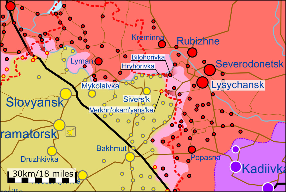 Новая линия обороны Вооруженных сил сейчас, насколько можно судить, проходит практически по административной границе Донецкой и Луганской областей — от Северска, Верхнекаменского и Спорного к Берестовому и донецкой Белогоровке. Последние два населенных пункта находятся на трассе Лисичанск-Бахмут. В случае если россияне все же изыщут свежие резервы и сумеют возобновить наступление, Силы обороны могут отойти на линию Славянск-Бахмут, снова разменяв, как выражаются военные, территорию на время. Которое, как вы знаете, работает на нас.