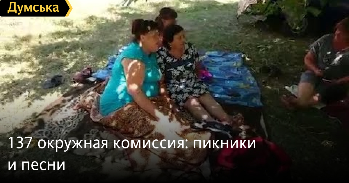 137 ОВК в Подольске. В ожидании своей очереди члены участковых комиссий расположились на подстилках на газоне. Некоторые из них поют народные песни.
