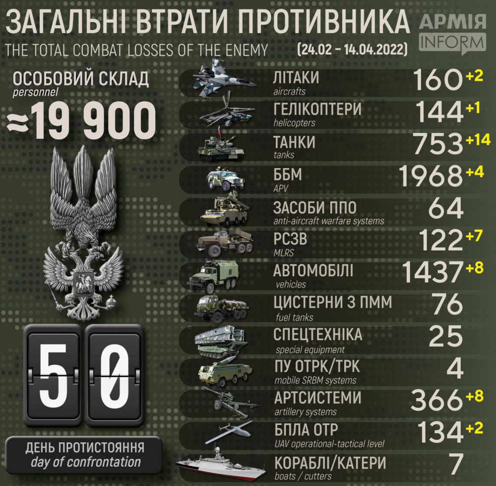 Всего с начала полномасштабного вторжения потери противника составили: примерно 19,9 тысяч оккупантов, 753 танка, 1 968 боевых бронемашин, 366 артсистем, 122 реактивные системы залпового огня, 64 средства ПВО, 160 самолетов, 144 вертолета, 1437 автомобилей, семь кораблей и катеров, 76 цистерн с топливом, 134 беспилотника, 25 единиц спецтехники и четыре пусковые установки оперативно-тактических ракетных комплексов.