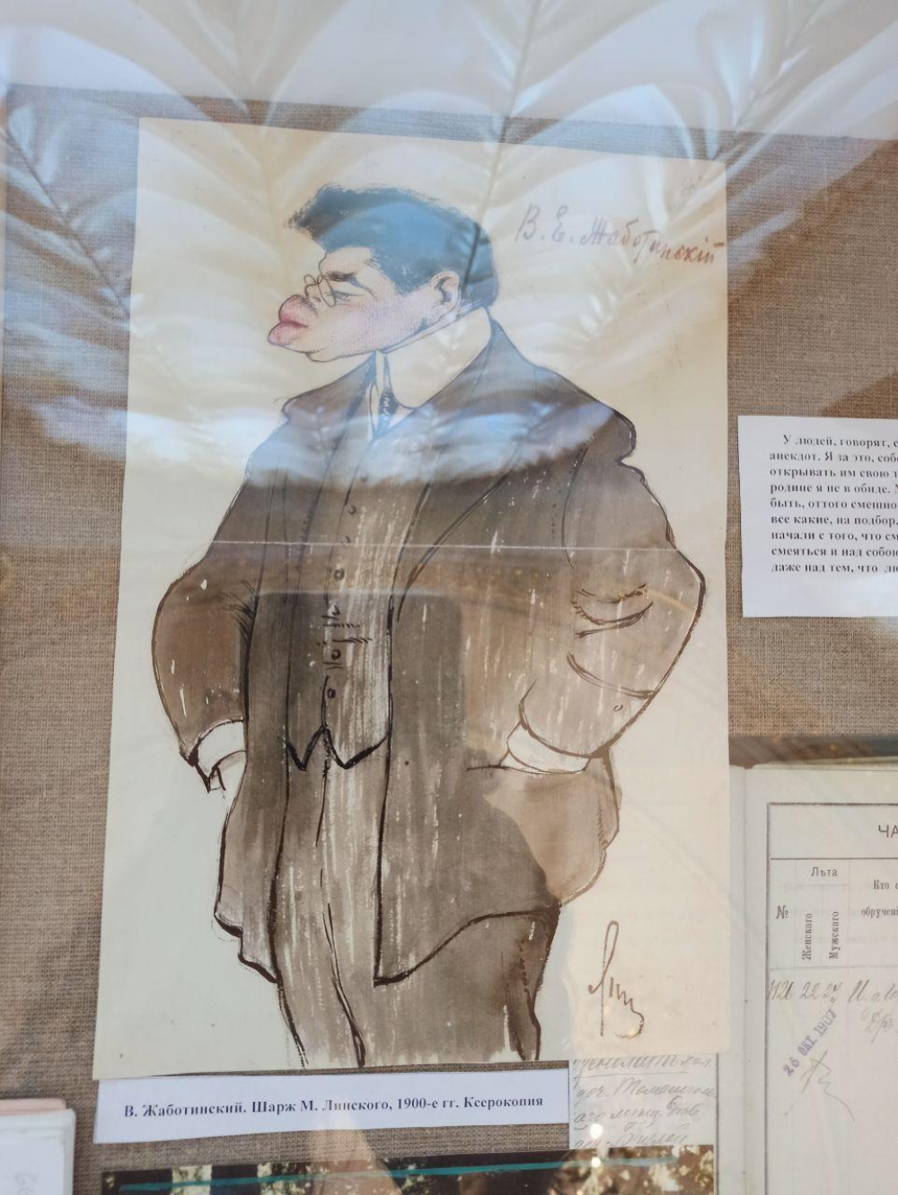 Сегодня в Золотом зале Одесского литературного музея открылась выставка, посвященная еврейскому писателю, поэту и лидеру правого сионизма Владимиру (Евгеньевичу) Зееву Жаботинскому. Дата выбрана неслучайно — 4 августа исполнилось 80 лет со дня смерти писателя, а 17 октября этого года исполняется 140 лет со дня рождения. Экспозиция заняла несколько витрин в эркере зала музея. Здесь представлены как оригиналы, так и копии документов, фотографий, книг и картин, свидетельствующих о жизни знаменитого одессита. Часть материалов была взята из фондов музея, а часть – научные сотрудники отыскали в одесских городских архивах. Среди наиболее значимых экспонатов – выписка из раввината о рождении Владимира Жаботинского, перевод поэмы Эдгара Алана По «Ворон» на русский язык, литературный справочник «Жаботинский в Одессе», шаржи Михаила Линского, книги с автографами и многое другое. Также представлены копии фотографий внутренних интерьеров дворца Гагариных (ныне Литературный музей) начала 20-го века, в частности Золотой, Виноградный и Охотничий залы. В этом особняке собирались члены Литературно-артистического общества или коротко ЛАО, одним из которых был юный Жаботинский. Среди прочих документов есть запись в книге одесского раввината о заключении брака между Владимиром Жаботинским и Ханной Гальпериной и трогательный мадригал, посвященный возлюбленной писателя. Этот брак подарил поэту сына Ария. Известно, что потомки Жаботинского до сих пор проживают на территории Израиля, о чем так мечтал сам Владимир Евгеньевич. «Главным в его жизни — было создание государства Израиль и он всего себя посвятил воплощению этой мечты», — отметила ведущий научный сотрудник музея Анна Божко. К слову, в конце прошлого года в музее появилась постоянная экспозиция, посвященная Жаботинскому, где представлены экспонаты, связывающие его с Одессой. Выставка будет открыта до октября. СМЕРТЬ РОСІЙСЬКИМ ОКУПАНТАМ! Помітили помилку? Виділяйте слова з помилкою та натискайте control-enter |