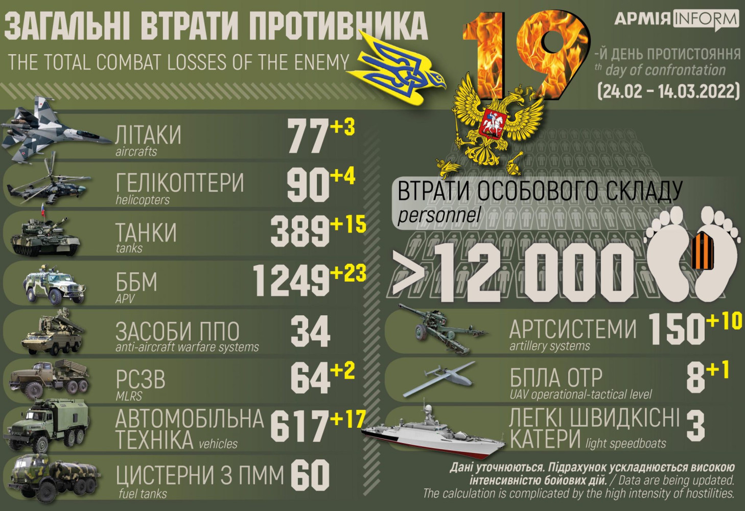 За сутки российские нацисты потеряли в Украине 15 танков и три самолета (инфографика)Тысячи единиц военной техники противника уничтожены или стали трофеями украинских военных. Более двенадцати тысяч оккупантов убиты, ранены или в плену. Генштаб Вооруженных сил Украины приводит данные по потерям российских нацистов — общие и за последние сутки. Уничтожены или стали трофейными 389 танков (+15 за сутки) и 1249 боевых бронированных машин (+23), 150 единиц артиллерии (+10) и 64 (+2) реактивные системы залпового огня, 33 средства противовоздушной обороны, 77 самолетов (+3) и 83 вертолета (+4), 617 автомобилей (+17), два катера и один корабль, 60 цистерн с горючим, восемь беспилотников оперативно-тактического уровня (+1). СМЕРТЬ РОССИЙСКИМ ОККУПАНТАМ! Заметили ошибку? Выделяйте слова с ошибкой и нажимайте control-enter |