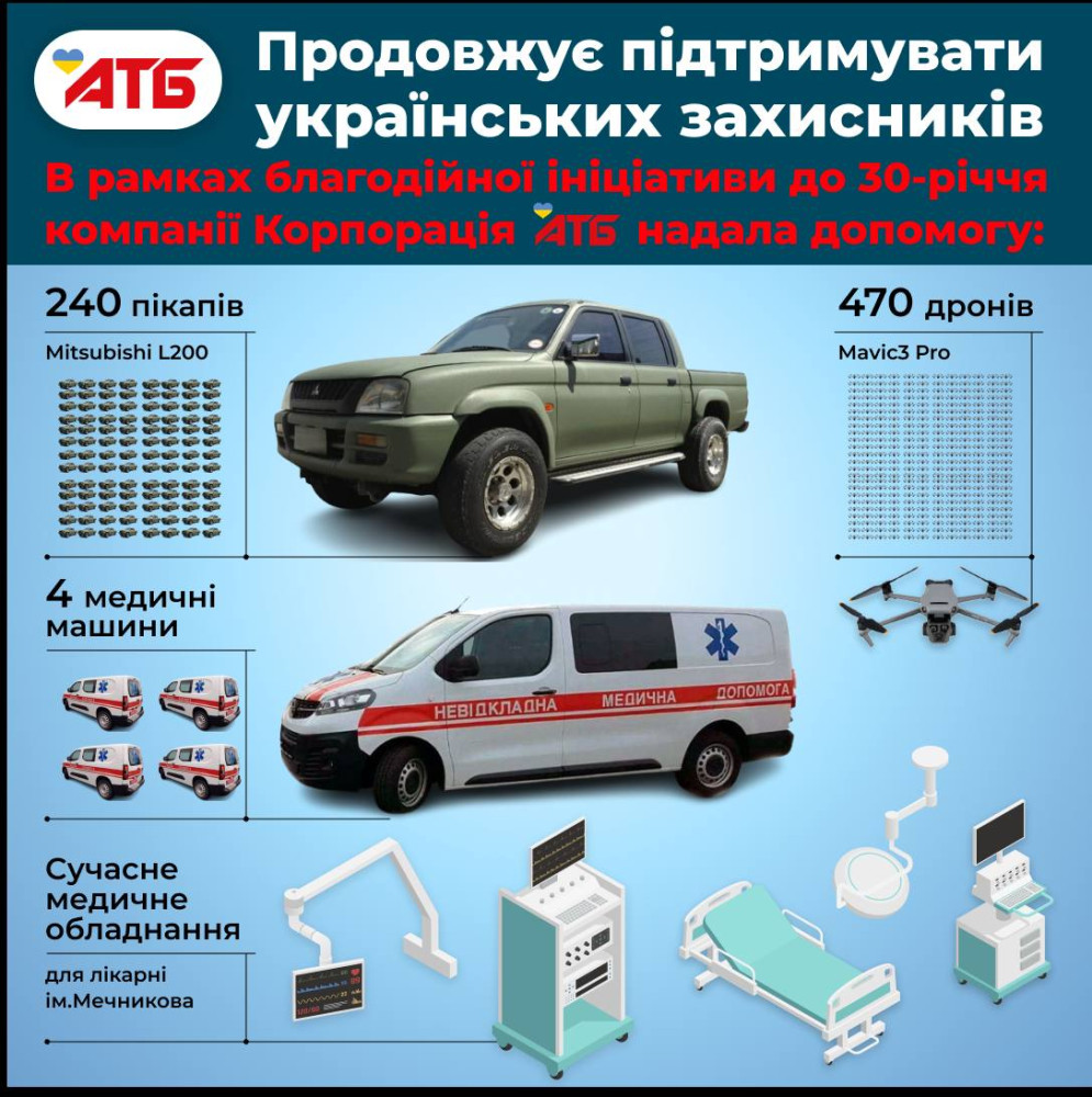 240 пікапів, 470 дронів та медобладнання для ЗСУ — підсумки благодійного марафону АТБ (новини компаній)Нещодавно добіг кінця безпрецедентний за масштабом благодійний марафон АТБ, влаштований з нагоди 30-річчя заснування компанії. Зважаючи на повномасштабне вторгнення ворога, святкування ювілею вирішили провести без зайвого у цій ситуації галасу. Як розповіли в компанії, натомість тридцяту річницю АТБ було цілковито присвячено підтримці українських захисників. Взявши за мету зібрати для Збройних сил України стомільйонний донат, АТБ за два місяці проєкту навіть значно перевиконала план. Було зібрано та вже інвестовано у нашу майбутню перемогу вражаючу суму – 168 мільйонів гривень! «Під час нашого святкування ми поставили перед собою амбітну мету. Як визнані лідери, котрі формують унікальні тренди не тільки в галузі роздрібної торгівлі, але й для багатьох інших сфер, хочемо започаткувати нову традицію. Впровадити для усього українського ринку гідну та своєчасну ініціативу — конвертувати всі подарунки в донат для ЗСУ», — повідомив тоді про старт «ювілейного» марафону Борис Марков, генеральний директор і голова Ради директорів корпорації «АТБ», закликаючи широкий загал долучитися до благородної справи. Благодійний марафон проходив на базі більш ніж 1200 дискаунтерів торговельної мережі, охопивши майже всі куточки нашої країни. Кожен бажаючий міг зробити власний внесок у наближення нашої перемоги. Для цього компанія спеціально розробила та випустила ексклюзивну «Колекцію єдності АТБ», до якої увійшли товари та сувеніри на будь-який смак з різних цінових категорій — фірмові записнички, стікери, патріотичні наліпки, футболки, худі, шкарпетки, чашки, канцелярські товари та безліч цікавих дрібничок. Кошти від продажу ювілейних товарів у всіх магазинах АТБ, включно з онлайн-магазином, спрямували на допомогу нашим захисникам. Також за бажанням можна було дистанційно задонатити за зазначеними реквізитами. «Завдяки єднанню українських громадян навколо священної мети та долученню партнерів по бізнесу вдалося зібрати чималу суму – 68 млн гривень. АТБ додала до них ще 100 мільйонів власних коштів, збільшивши розмір ювілейного донату до 168 млн грн. Станом на сьогодні всі ці кошти вже воюють на нашому боці, рятуючи життя українським воїнам і допомагаючи нищити ворога», — повідомили в релізі компанії. Військовим підрозділам придбали та передали 240 всюдихідних пікапів Mitsubishi L200. Ці надійні та багатофункціональні автівки в умовах сучасної війни є майже незамінними, оскільки завдяки їм можна виконувати безліч завдань – від оперативної евакуації поранених з поля бою до боротьби з масованими атаками ворожих безпілотників-шахедів, від підвозу боєкомплектів на передову до виконання секретних місій розвідниками. Це так звана робоча конячка фронту. Надійна, міцна, потужна. Також коштом ювілейного донату від АТБ українську армію дронів поповнили 470 сучасних БПЛА Mavic 3 Pro, які добре зарекомендували себе в реальних бойових умовах. Такі апарати фактично є очима наших артилеристів, ракетників і незамінні для аеророзвідки. Військові медики отримали чотири новенькі спеціалізовані автівки. Дніпропетровська обласна клінічна лікарня ім. Мечникова — сучасне медичне обладнання, яке значно розширило можливості для порятунку життя та повернення з