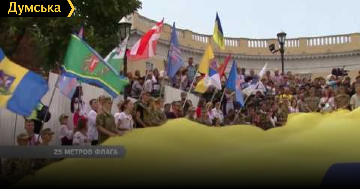 В День Флага на Потемкинской лестнице растянули двадцати пяти метровый символ Украины. С каждым годом количество людей, которые отмечают праздник, увеличивается.
