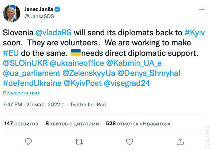 Об этом сообщил премьер-министр Словении Янез Янша. Он отметил, что дипломаты хотят работать в нашей столице, как волонтеры.