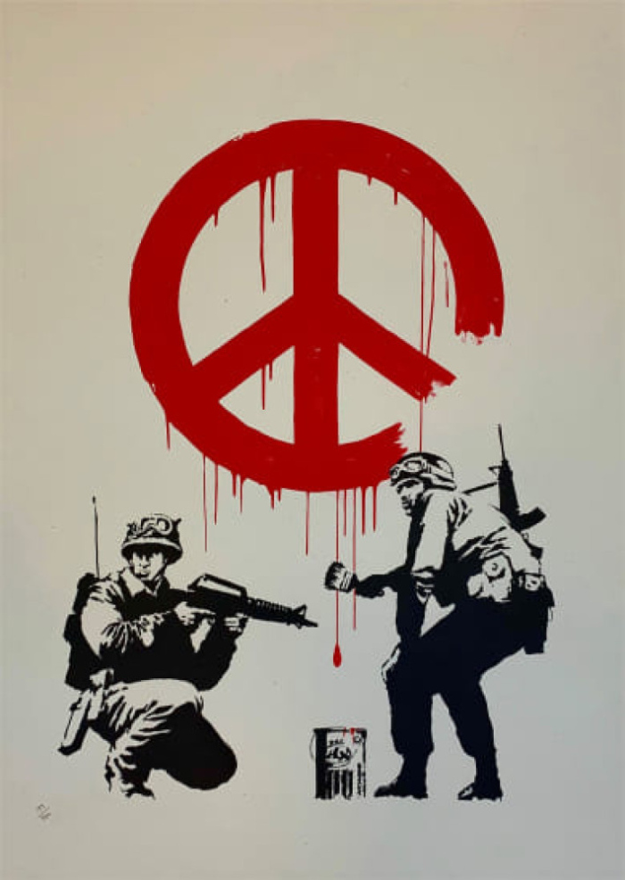 ОБНОВЛЕНО В 15:05. Уникальная антивоенная картина Бэнкси — Вanksy's CND Soldiers, unsigned — выставлена для продажи на благотворительном аукционе в Лондоне.