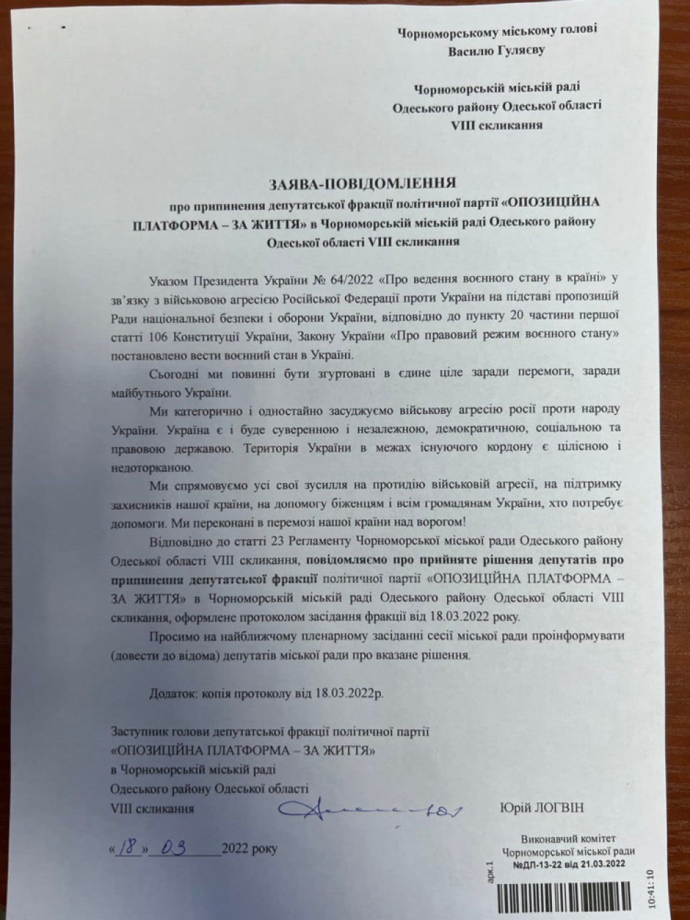 ОБНОВЛЕНО В 17:15. Депутаты Черноморского городского совета Одесской области от ОПЗЖ публично осудили войну, развязанную нацистской РФ против Украины, и распустили свою фракцию.