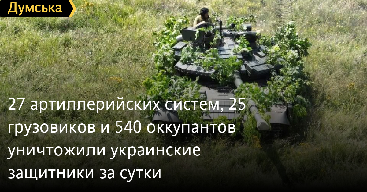 27 артиллерийских систем, 25 грузовиков и 540 оккупантов уничтожили украинские защитники за сутки540 российских захватчиков полегли в Украине 1 августа. Общие потери противника с начала полномасштабного вторжения выросли до 247 тысяч 230 военнослужащих. По данным Генерального штаба Вооруженных сил Украины, вчера наши воины сожгли 27 артиллерийских систем (4866), одну реактивную систему залпового огня (700). Также Силы обороны уничтожили вражескую установку ПВО (463) и 27 грузовиков и автоцистерн (7349). Наши воины подбили танк (4217) и восемь боевых бронированных машин (8213). ПВО сбила 15 беспилотников оперативно-тактического уровня (4042). СМЕРТЬ РОССИЙСКИМ ОККУПАНТАМ! Заметили ошибку? Выделяйте слова с ошибкой и нажимайте control-enter |