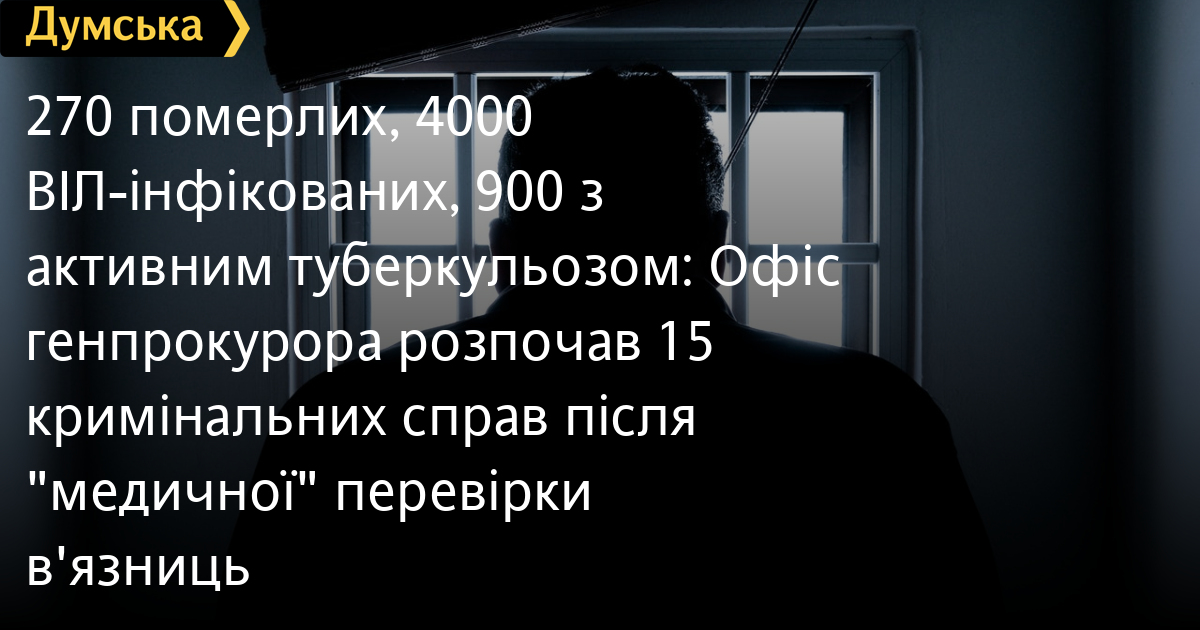 270 померлих, 4000 ВІЛ-інфікованих, 900 з активним туберкульозом: Офіс генпрокурора розпочав 15 кримінальних справ після «медичної» перевірки в'язниць15 кримінальних справ розпочали в Офісі генпрокурора після перевірки стану дотримання прав засуджених і взятих під варту осіб на належне медико-санітарне обслуговування та лікування. Як зазначає пресслужба відомства, у 2021 році у виправних колоніях та слідчих ізоляторах померло 270 осіб. Понад 4000 людей — ВІЛ-інфіковані, майже 900 хворіють на активну форму туберкульозу, більше 400 осіб перебували на стаціонарному лікуванні від інших захворювань. «Санітарно-технічний стан окремих приміщень медичних частин пенітенціарних установ, забезпеченість медичним обладнанням є незадовільними, — зазначають в ОГП. — Зафіксовано неналежні умови тримання осіб з інвалідністю, зокрема хворих з ампутованими кінцівками в одному з пенітенціарних закладів у Вінницькій області». Перевіркою встановлено, що майже в усіх медичних закладах пенітенціарних установ країни систематично порушуються права в’язнів на охорону здоров’я. Найбільш складна ситуація в Запорізькій, Кіровоградській, Київській, Одеській, Хмельницькій та Чернігівській областях. В прокуратурі стверджують, що хворих не завжди вчасно направляють в лікарні навіть за наявності показів до госпіталізації. Також порушення зафіксували при постановленні діагнозів. Зокрема, у медичній частині при Одеському СІЗО, де неправильно ставили діагнози майже у кожному третьому випадку. «Встановлено численні порушення при організації лікування хворих на ВІЛ/СНІД в частині дотримання термінів їх огляду, своєчасного встановлення діагнозу та призначення антиретровірусної терапії», — зазначають в Офісі генпрокурора. Також правоохоронці заявляють про несвоєчасне направлення пацієнтів з туберкульозом для надання спеціалізованої допомоги. Спостерігаються проблеми з діагностуванням та лікуванням вірусних гепатитів. Заступник генпрокурора звернувся до Мінюста з вимогою усунути виявлені порушення. СМЕРТЬ РОСІЙСЬКИМ ОКУПАНТАМ! Помітили помилку? Виділяйте слова з помилкою та натискайте control-enter |