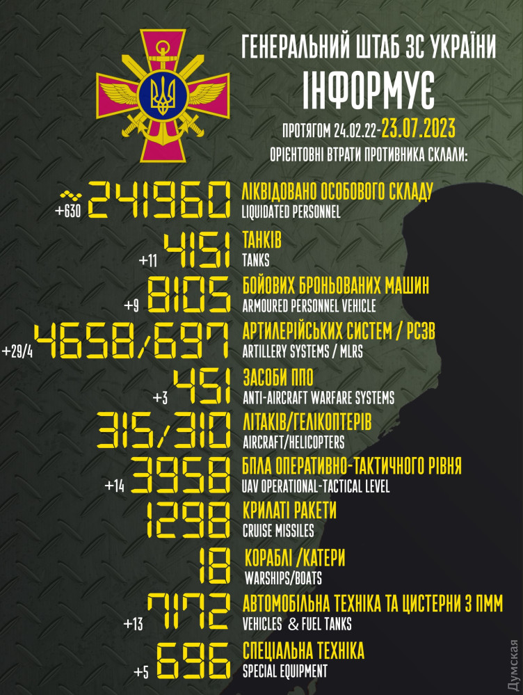 630 російських нацистів полягли в Україні 22 липня. За час повномасштабного вторгнення в Україну окупанти втратили вже 241 тисячу 960 своїх вояків.