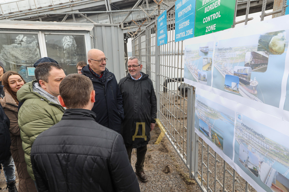 Сьогодні вдень із вантажними роботами ознайомилися надзвичайний та повноважний посол Чеської Республіки в Україні Радек Матула та його колега зі Словенії Томаж Менцін. Екскурсію для дипломатів провели Міністр аграрної політики та продовольства Микола Сольський та голова Одеської військової адміністрації Максим Марченко.