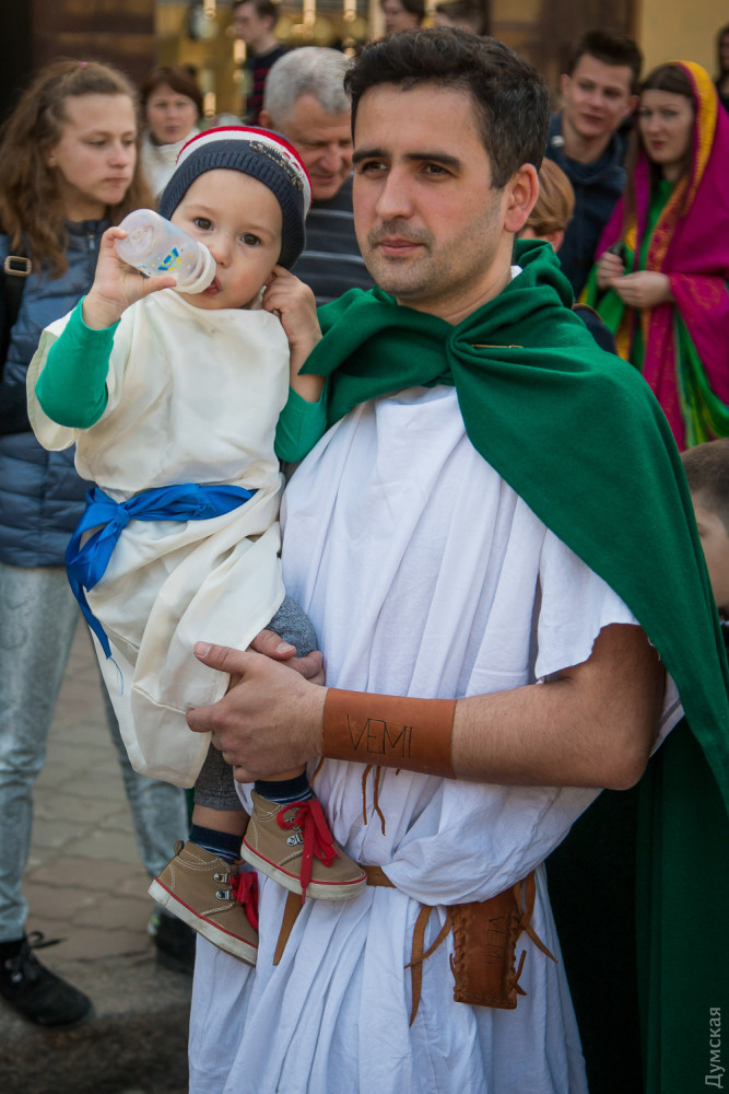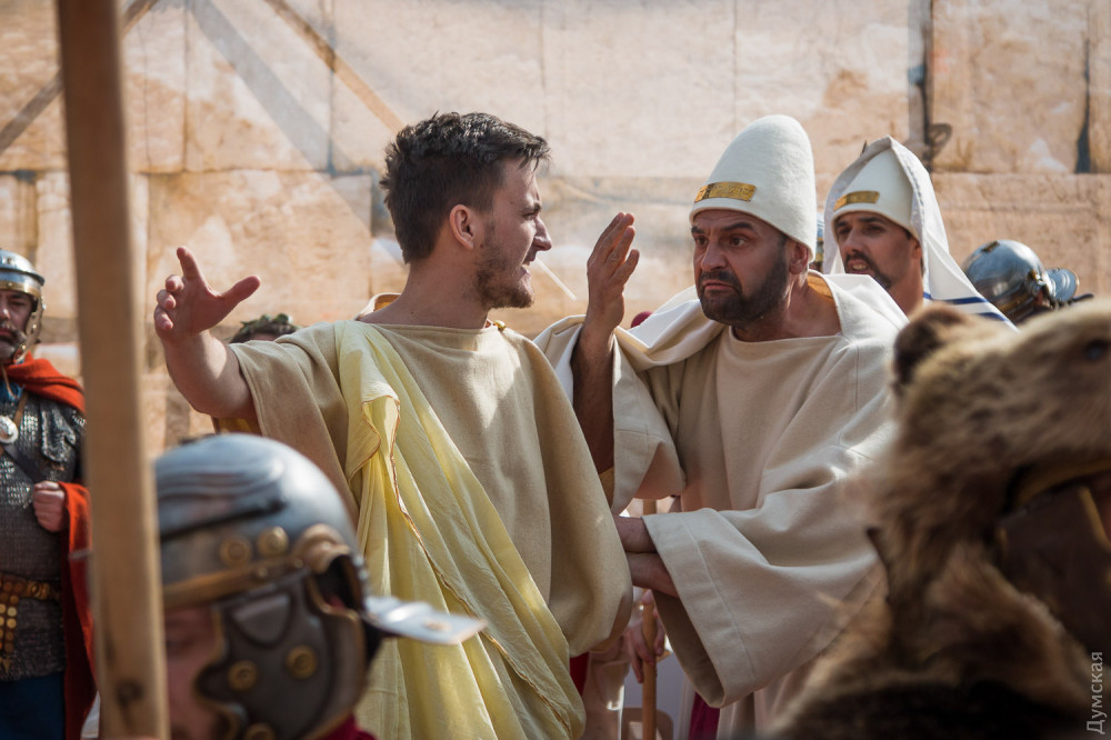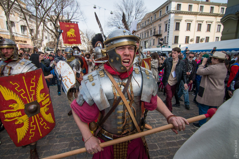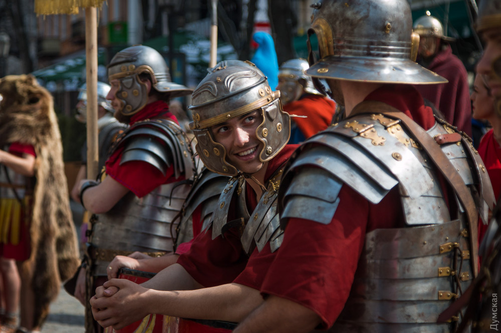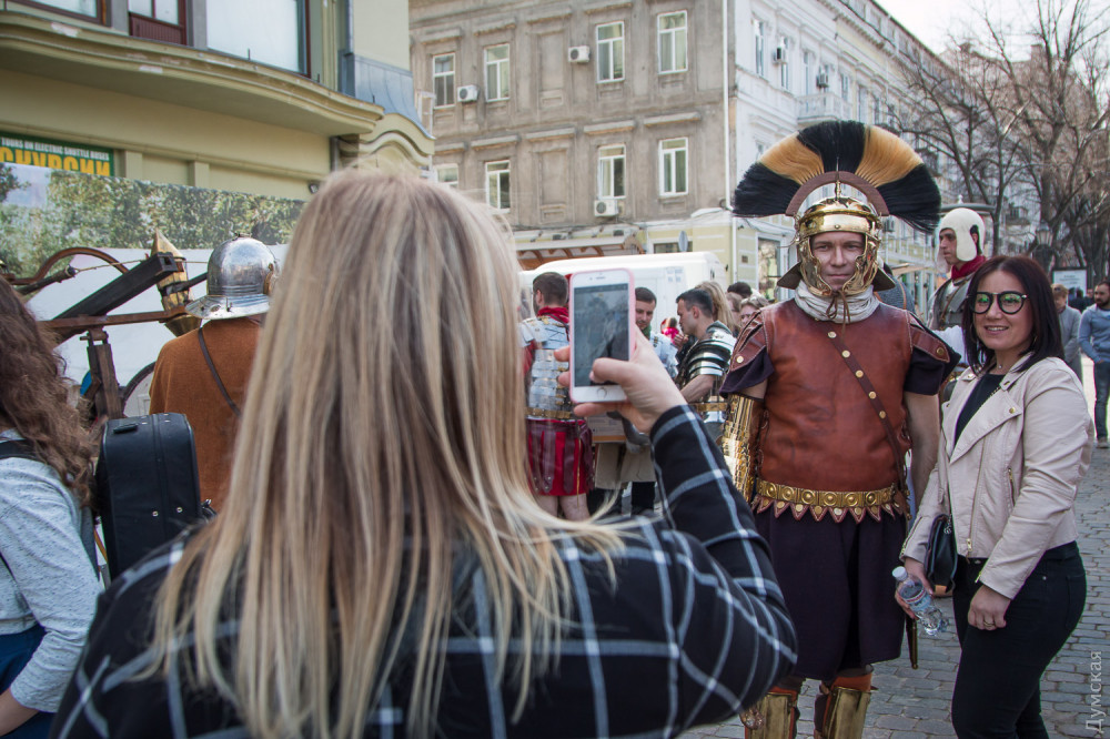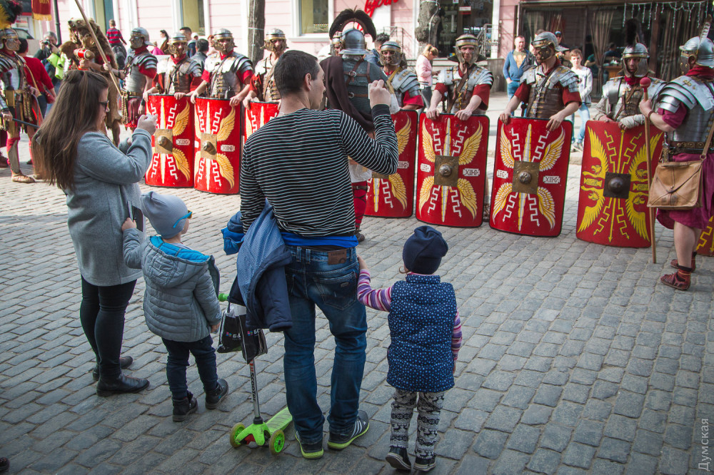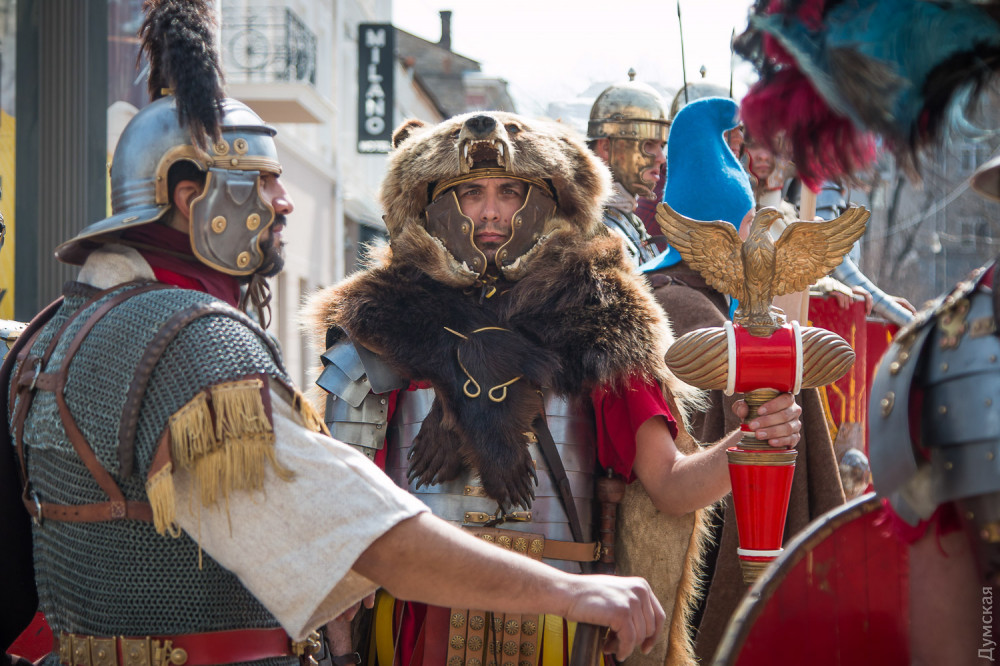 В помощь одесским реконструкторам, из года в год исполняющих роль бессердечных легионеров Римской империи, прибыло подкрепление в лице коллег из Румынии и Чехии. Особо колоритно смотрелся воин, облаченный в шкуру убитого медведя — дети, желающие сделать селфи, не отходили от него ни на шаг.
