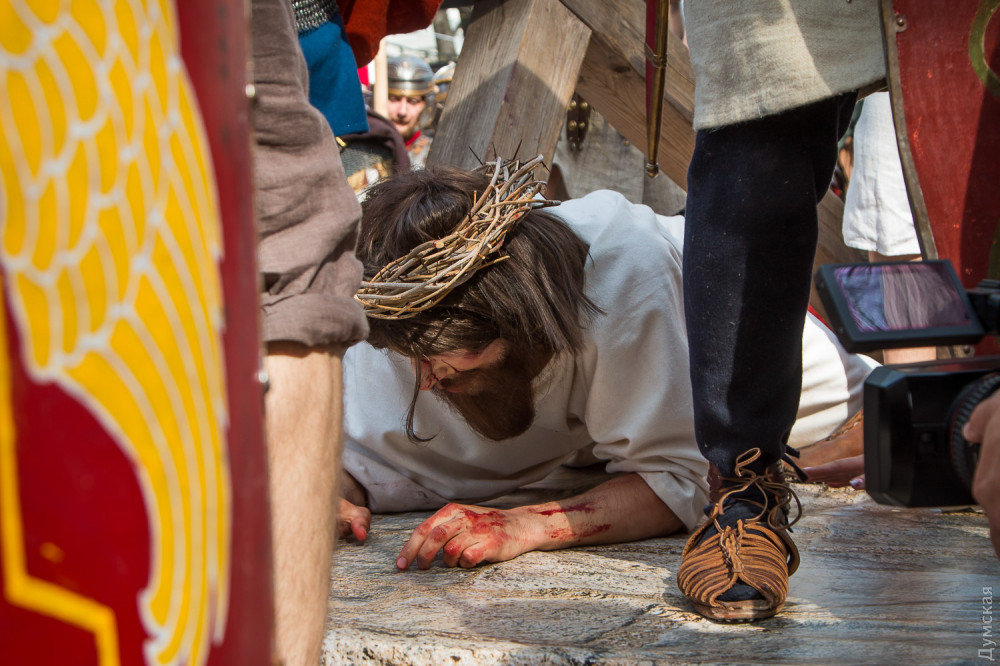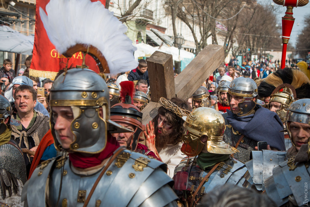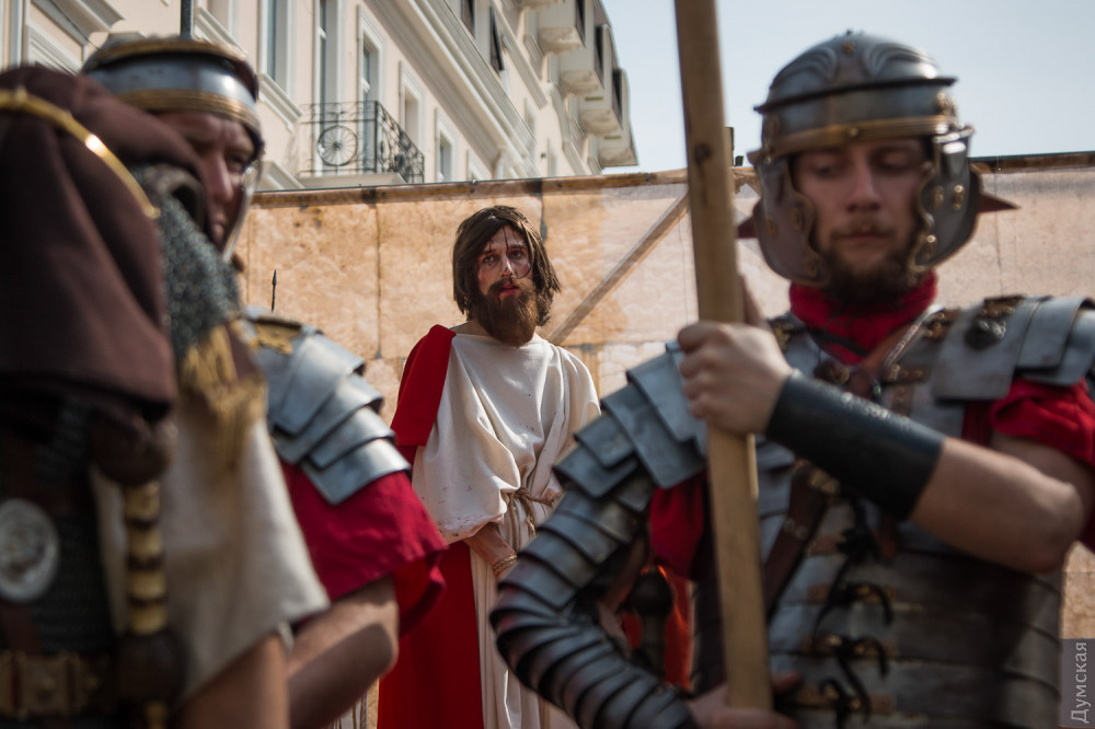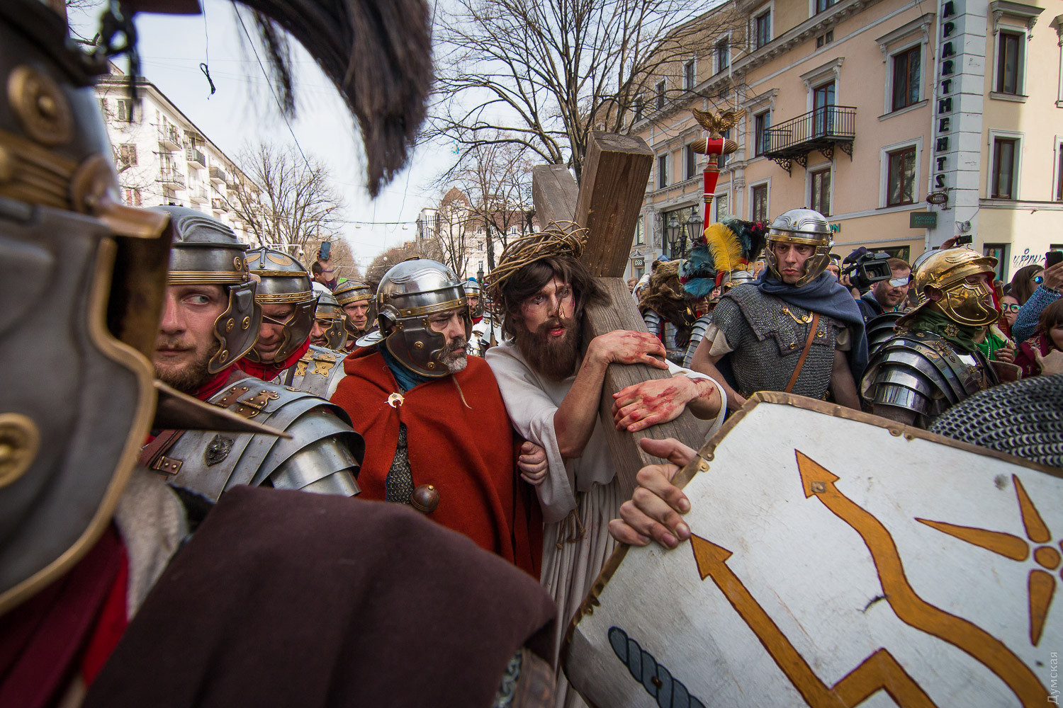 Иисус Христос стойко выдержал издевательства старших священников и достойно пронес свой крест от Екатерининской до входа в Пассаж, а легионеры, ничуть не отличаясь от современных сотрудников силовых ведомств, умело распихивали толпу.