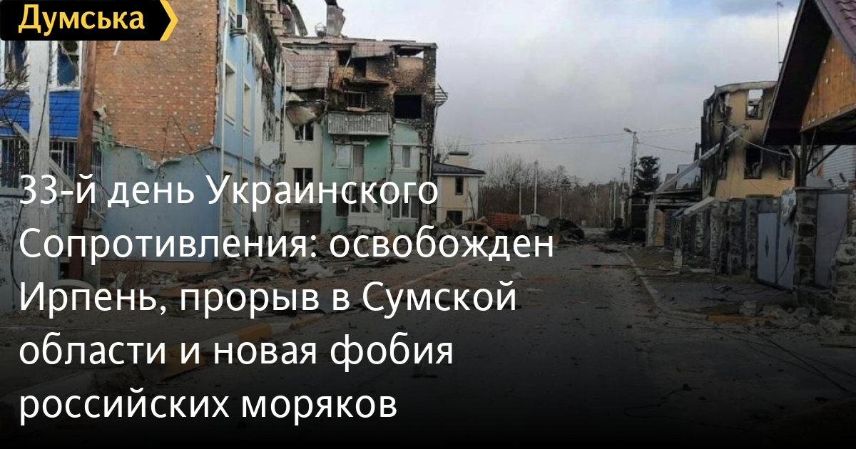 33-й день Украинского Сопротивления: освобожден Ирпень, прорыв в Сумской области и новая фобия российских моряковПодходят к концу 33-и сутки героического сопротивления украинского народа полномасштабному вторжению нацистской рф. Подводим итоги. Ситуация на фронтах практически стабилизировалась. Похоже, у российских нацистов, действительно, нет ресурсов для возобновления решительных наступательных действий. На военном языке это называется «позиционным тупиком» — стороны начинают закапываться в землю и делают ставку на артиллерию и воздушные удары. Впрочем, пока происходящее полноценной позиционной войной назвать нельзя. Судя по всему, маневренные бои продолжаются как минимум на двух направлениях – в Сумской области, где украинские защитники на днях сумели нанести удар вдоль государственной границы, отрезав от родины немаленькую группировку захватчиков (в том числе хваленую гвардейскую кантемировскую дивизию, на секундочку), и в Херсонской. В последней вчера и сегодня работали наши военные корреспонденты. Они сообщают, что сплошной линии фронта там нет, воюют небольшие кочующие группы – украинские и российские. Силы обороны наносят удары в северном направлении, к Днепру, и южном, пытаясь прижать оккупантов к черноморскому берегу. В сам Херсон они зайти не пытаются, да и это чревато: враг сосредотачивает там немалые силы, явно готовясь к контрударам. Мы внимательно следим за происходящим в степях. В Донецкой и Луганской областях продолжается форменный зерграш: российское командование буквально заваливает мясом из мобилизованных жителей ОРДЛО укрепрайон Объединенных сил. Украинские бригады с удовольствием отправляют гостей на тот свет, удерживая позиции. Смысл происходящего не очень понятен, но искать логику в действиях Москвы сейчас – гиблое дело. Показательно отсутствие какой-то серьезной активности со стороны российского флота: видимо, урок Бердянска выучен и усвоен, и в ближайшее время к украинскому берегу корабли рф подходить не будут, сосредоточившись на нанесении ракетных ударов по гражданской и военной инфраструктуре. В общем, десант в районе Одессы так и остался страшилкой для слабонервных. Небо над Украиной россиянам взять под полный контроль так и не удалось. Наши доблестные Воздушные силы продолжают вести бои, сбивая самолеты, вертолеты и ракеты врага. Вчера отличились одесские ПВОшники, которые уничтожили на северной окраине города крылатую ракету. Честь! Спасибо! Отличная новость пришла к вечеру из Киевской области. Полностью освобожден от захватчиков Ирпень, сейчас его зачищают от остатков подразделений противника. Это значит, что контрудар на северо-западном направлении от столицы продолжается, и группировка рф, действительно, или совсем окружена, или находится в полуокружении. Опрошенные нами эксперты выразили сомнение в масштабе минных постановок рф в Черном море. Они не исключают, что агрессор подбросил несколько мин к берегам Турции, Болгарии и Румынии, чтобы создать видимость серьезной минной угрозы (обвинив в ней Украину) и таким образом нанести экономический удар по нашей стране: понятно, что в подобных условиях морская торговля просто невозможна, а мы от нее сильно, если не критически, зависим. Как бы то ни было, после победы все равно придется серьезно прошерстить акваторию на пре