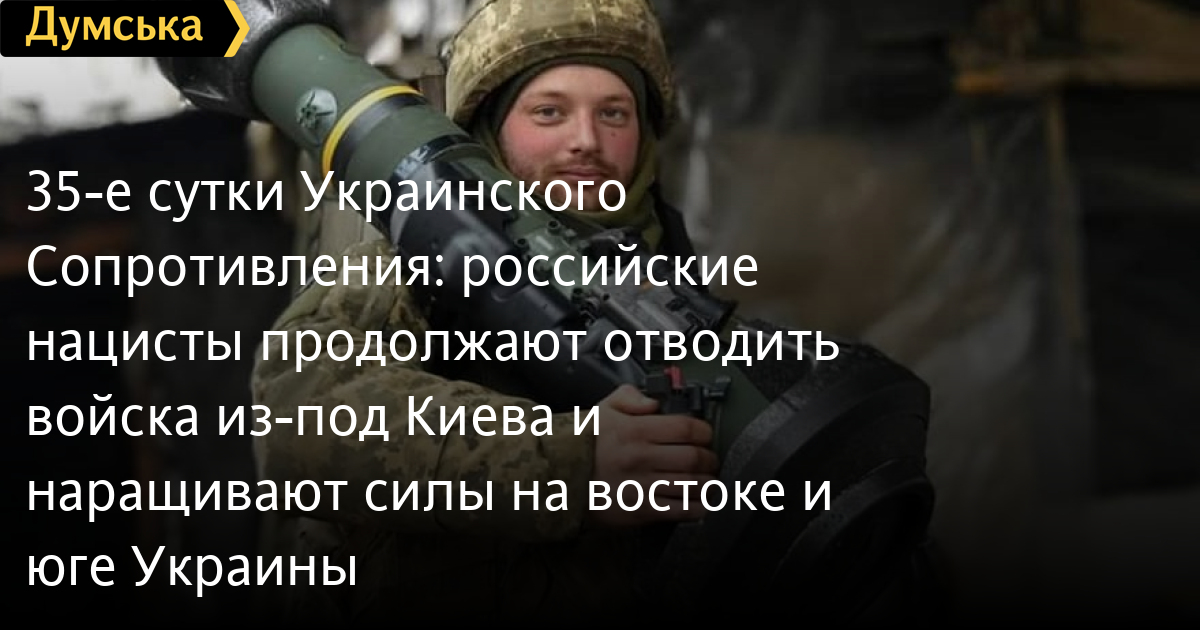 Заканчиваются 35-е сутки героического сопротивления украинского народа полномасштабному вторжению нацистской России. Главная новость – мы не просто держимся, но и освобождаем захваченные города и села.