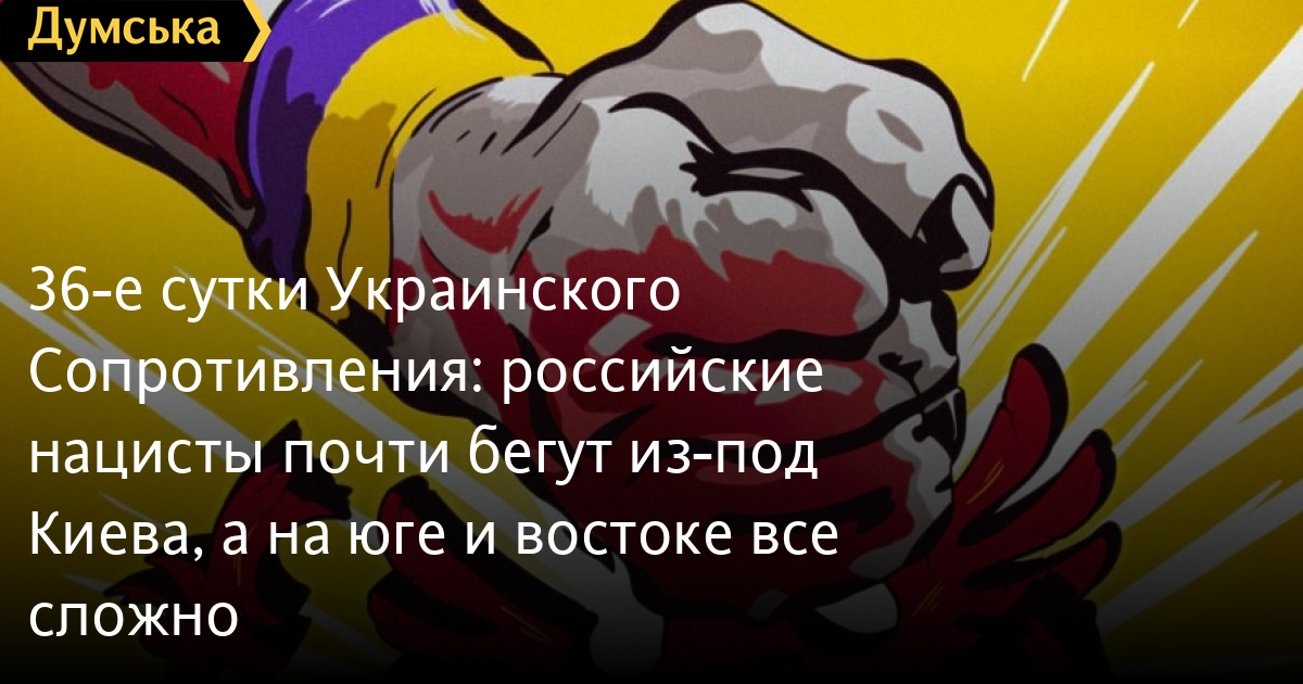 Заканчиваются 36-е сутки Украинского Сопротивления. Главная новость остается прежней – Украина выстояла, Украина борется, украинский народ един в своем стремлении отстоять свободу и независимость.