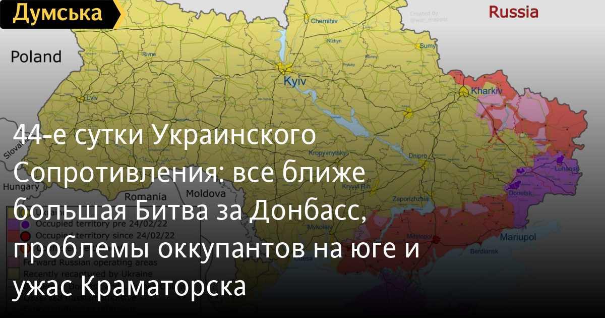 Заканчиваются сорок четвертые сутки Украинского Сопротивления полномасштабному вторжению нацистской россии. Противник так и не смог пока достичь ни одной из своих целей – более того, «денацификация» и «демилитаризация» его войск происходит куда быстрее, чем Москва запланировала эти процессы для нас с вами.