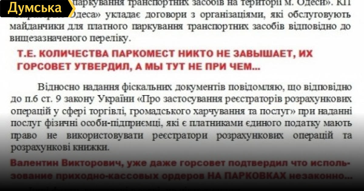 КП «Парксервис» ответил «Общественному контролю дорог» — «ситуация с парковками просто замечательная»Как сообщала «Думская» ранее, 25 августа руководитель «Общественного контроля дорог» Сергей Дубенко опубликовал открытое обращение к мэру Одессы, в котором рассказал о существующем в городе «парковочном беспределе» и выдвинул список требований к Костусеву. Вчера, 22 сентября, как пишет портал «Общественного контроля дорог» 4road.net, на электронную почту организации 4road@list.ru пришло письмо под названием «Ответ на обращение к Одесскому городскому голове» за подписью начальника КП «Парксервис» Валентина Гапунича. Приводим ниже его текст без сокращений. Шановний Сергію Олександровичу! На Ваше звернення на «Телефон довіри Одеського міського голови» від 12.09.2011р. повідомляю, що 15 серпня 2011р. Одеським міським головою було надано доручення щодо приведення майданчиків для платного паркування транспортних засобів у місті Одесі до вимог постанови Кабінету Міністрів України від 03.12.2009р. № 1342 «Про затвердження правил паркування транспортних засобів». Станом на 21.09.2011р. більшість майданчиків для платного паркування транспортних засобів було приведено до вимог вищезазначеної постанови, а саме, встановлені дорожні знаки «початок платної парковки» та «кінець платної парковки», позначені суцільною синьою смугою на проїзній частині і на бордюрі, який відокремлює проїзну частину від пішохідної. На майданчиках для платного паркування транспортних засобів у доступному для ознайомлення користувачів місці розміщена інформація про оператора, вартість послуг з утримання майданчиків для платного паркування, спосіб оплати. Також облаштовані місця, позначені дорожніми знаками та розміткою для паркування транспортних засобів, зазначених у частині шостій статті 30 Закону України «Про основи соціальної захищеності інвалідів в Україні». Відносно площі майданчиків для платного паркування повідомляємо, що перелік майданчиків для платного паркування транспортних засобів у м. Одесі з зазначенням площі затверджений рішенням Одеської міської ради № 520 від 08.04.2011р. «Про затвердження переліку спеціальних земельних ділянок, відведених для організації та провадження діяльності із забезпечення паркування транспортних засобів на території м. Одеси». КП «Парксервіс-Одеса» укладає договори з організаціями, які обслуговують майданчики для платного паркування транспортних засобів відповідно до вищезазначеного переліку. Відносно надання фіскальних документів повідомляю, що відповідно до п.6 ст. 9 закону України «Про застосування реєстраторів розрахункових операцій у сфері торгівлі, громадського харчування та послуг» при наданні послуг фізичні особи-підприємці, які є платниками єдиного податку мають право не використовувати реєстратори розрахункових операцій та розрахункові книжки. Інші факти, викладені в заяві, не підтвердились. З повагою, в.о. директора В.В.Гапуніч вик. Ногай Д.С. тел. 705-11-92 «Общественный контроль дорог» предлагает самим одесситам прокомментировать данный ответ.