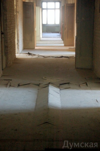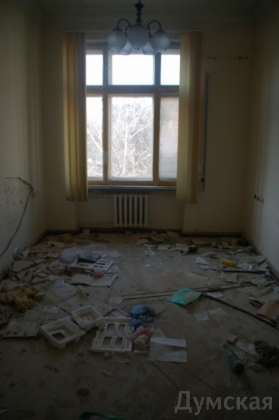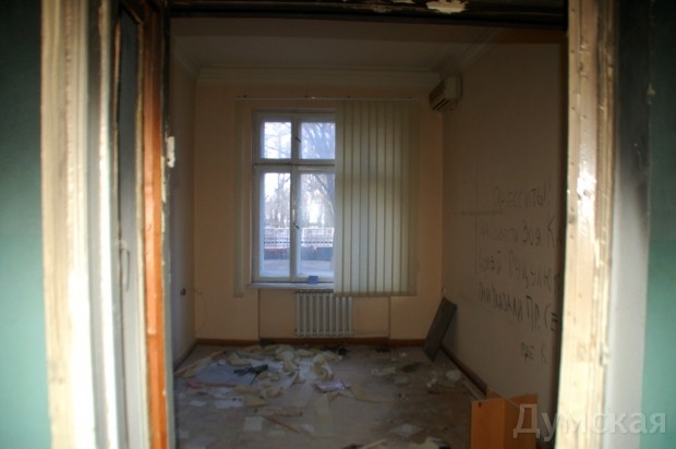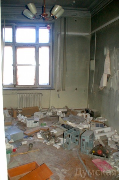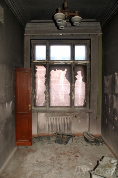 Кабинеты, в которых были закрыты и заклеены окна, никак не пострадали от пожара — здесь нет ни следов огня, ни закопченных стен, ни потемневших потолков. Гораздо больше вреда им нанесли мародеры, которые перевернули вверх дном и вынесли все более-менее ценное. Если же окна были разбиты или раскрыты, комнату заполнял дым. Сажа оседала на потолках, на стенах — на холодных крашеных местах больше, на календарях и бумажных объявлениях меньше. Даже сейчас, после уборки строительного мусора, можно составить карту задымления по всем этажам, а по следам обугливания на дверях — установить температуру во время пожара.