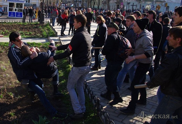По дороге никаких приключений не было. Зато уже на Приморском бульваре выяснилось, что из исторического центра разошлись не все участники митинга «за Украину». Первая небольшая потасовка произошла у археологического музея. А когда основная колонна дошла по памятника великому французу, произошло массовое сотрясение воздуха: «патриоты» (большинства которых, к слову, в Одессе никто раньше не видел) защищали памятник Дюку, а «оккупанты» их от этого памятника отгоняли. Хотя и вполне могли пройти мимо.
