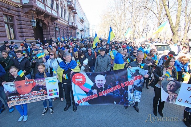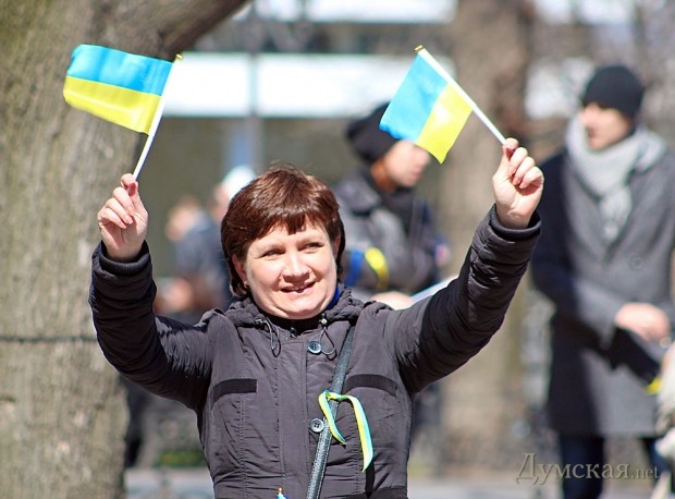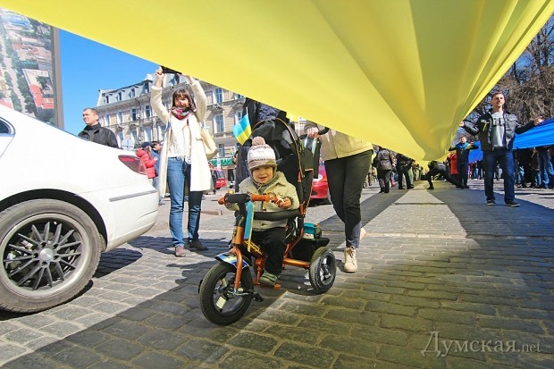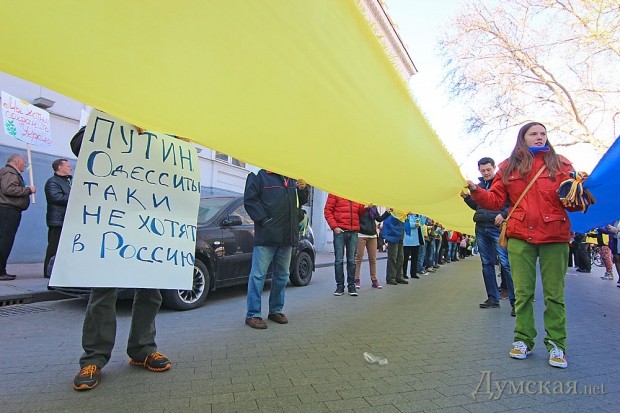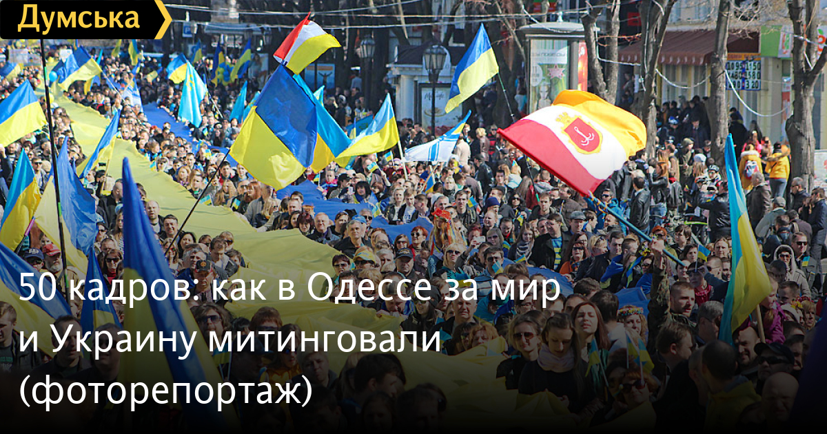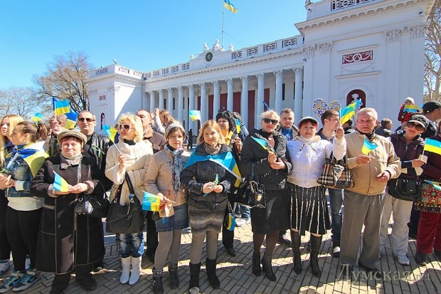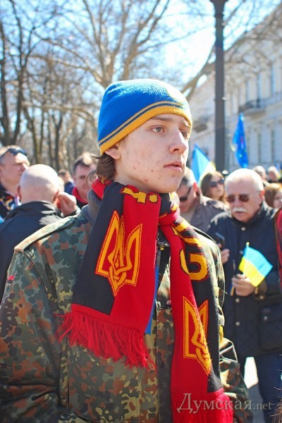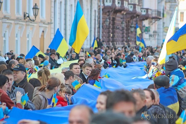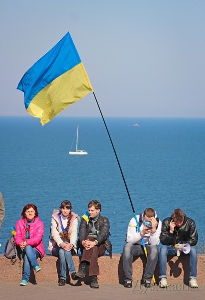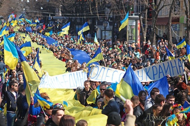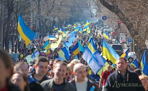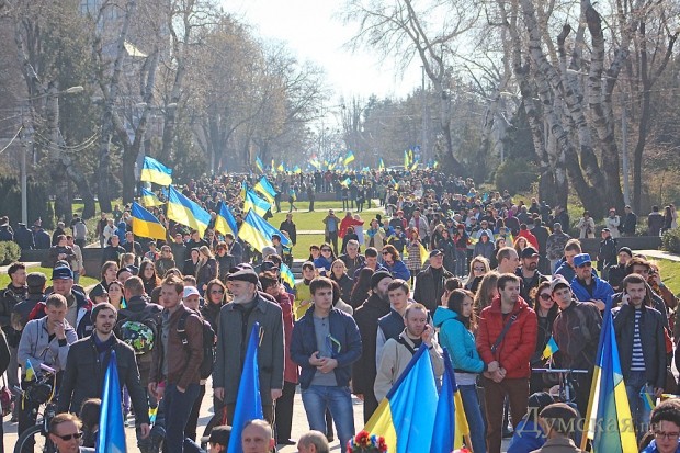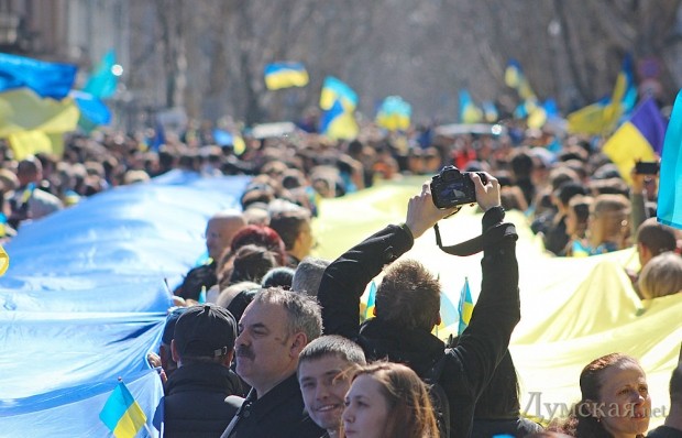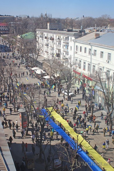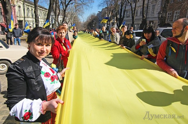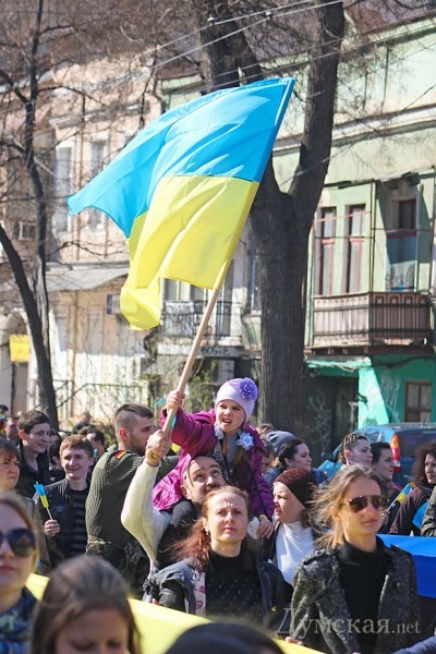 Около десяти тысяч одесситов с большим количеством национальной символики — от небольших флагов до огромного желто-голубого километрового стяга — прошествовали по центральным улицам, от памятника Дюку до Аллеи Славы в парке Шевченко. Люди скандировали «Одесса — Украина», «Путин-гэть», «Мы за мир» и периодически исполняли гимн Украины.