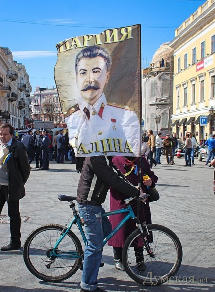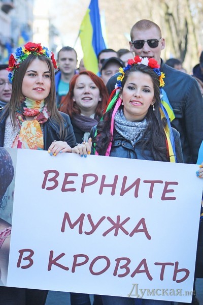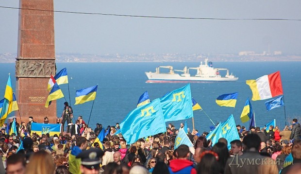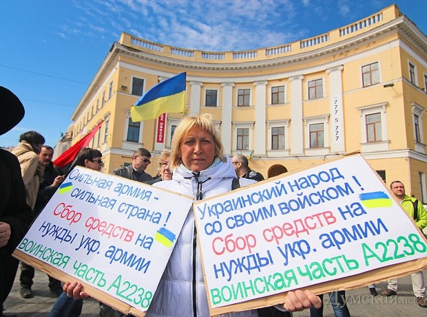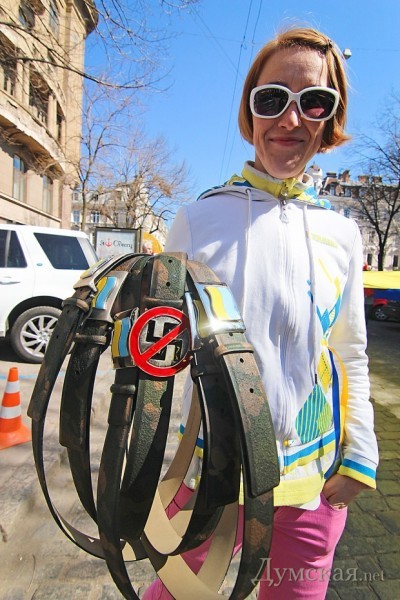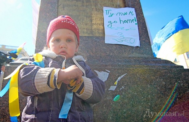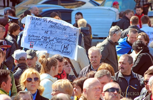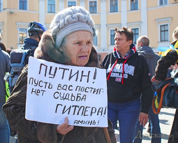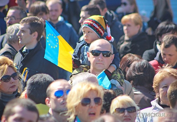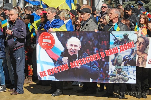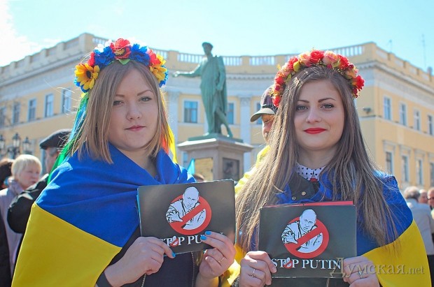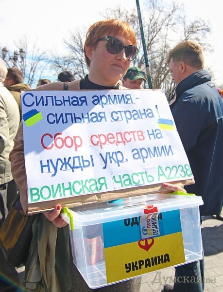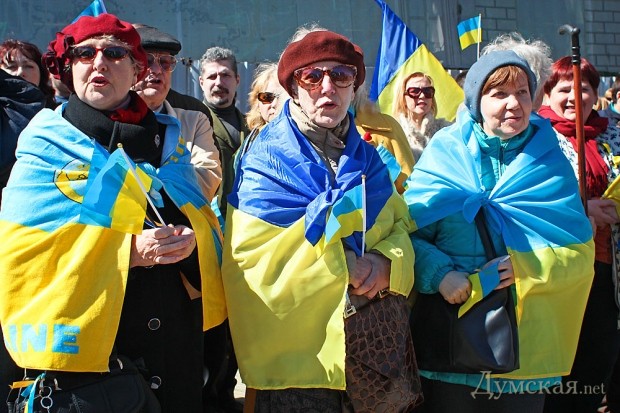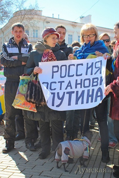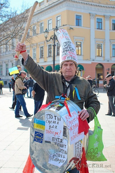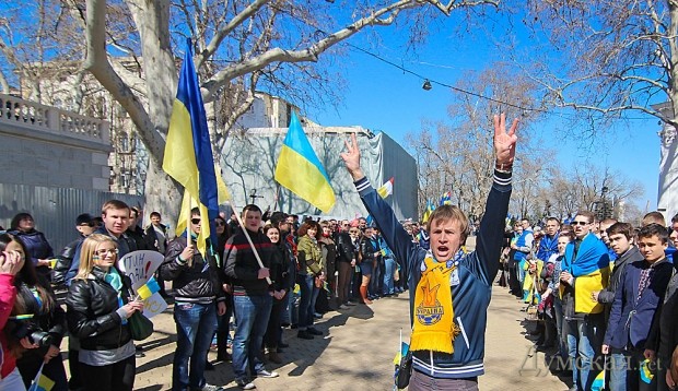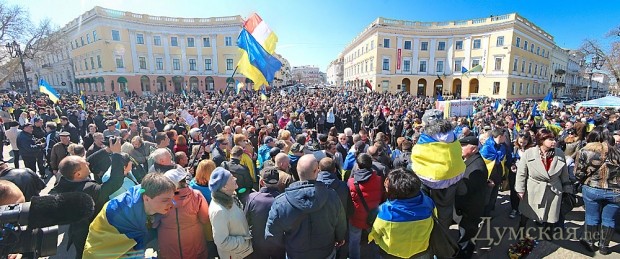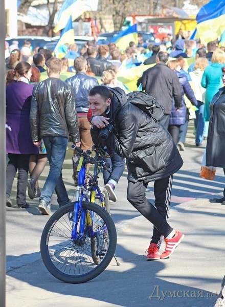 Около десяти тысяч одесситов с большим количеством национальной символики — от небольших флагов до огромного желто-голубого километрового стяга — прошествовали по центральным улицам, от памятника Дюку до Аллеи Славы в парке Шевченко. Люди скандировали «Одесса — Украина», «Путин-гэть», «Мы за мир» и периодически исполняли гимн Украины.
