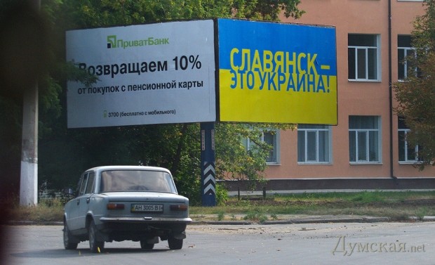 Итак, Славянск. Население – 120 тысяч человек. По крайней мере, номинально. Для простоты понимания его можно сравнить с Ильичевском: тихие улочки, сонные жители. Не мегаполис, в общем. О войне (из того, что удалось рассмотреть) здесь больше напоминает наружная реклама, чем разрушенные дома. То есть, разрушений, конечно, хватает, но созданная российской пропагандой картинка эдакого донбасского Сталинграда с испещренными следами от осколков руинами и голодными жителями, которые дерутся за пакет с гуманитарной помощью, действительности не соответствует.