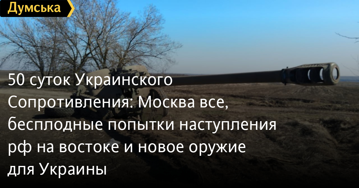 Итак, заканчиваются 50-е сутки Украинского Сопротивления. Главная новость остается прежней: наш народ выстоял, мы побеждаем. Нацистская россия в растерянности и, похоже, не очень понимает, что делать дальше. Может, все-таки решатся прибить своего фюрера?