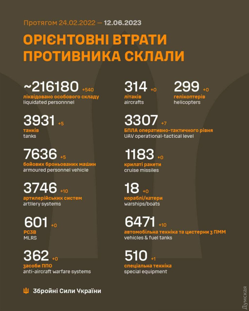540 російських загарбників полягли в Україні 11 червня. За час повномасштабного вторгнення українські захисники ліквідували вже 216 тисяч 180 солдатів і офіцерів ворога.