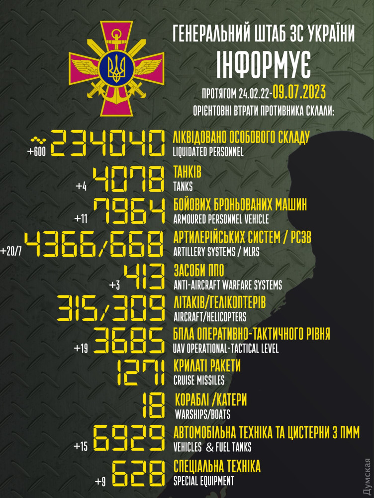 600 російських солдатів і офіцерів було знищено в Україні 8 липня. Від початку повномасштабного вторгнення втрати противника становлять уже 234 тисячі 40 військовослужбовців.