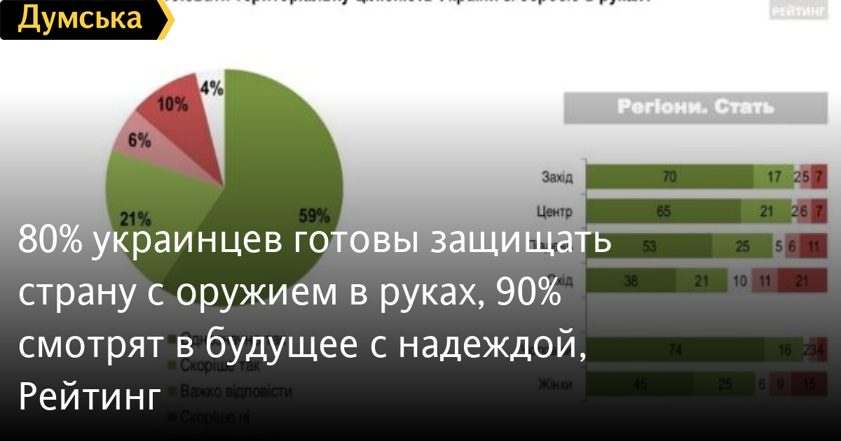 90% украинцев, думая о ситуации в стране, питают надежду. Лишь 5% испытывают разочарование. Защищать свой дом с оружием в руках готовы 80% жителей страны.