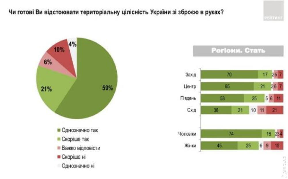 Наивысший уровень готовности наблюдается на Западе и в Центре, более низкий уровень готовности – на Юге и Востоке (на Юге – почти 80%, на Востоке – почти 60%). В гендерном разрезе готовность воевать с оружием за Украину выразили 90% мужчин и 70% женщин.