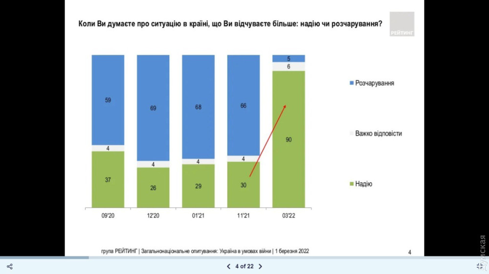 88% опрошенных верят в то, что Украина сможет отразить нападение России. Практически каждый день этот показатель растет. Только 10% сегодня не имеют такой уверенности. Вера в победу во всех регионах страны.