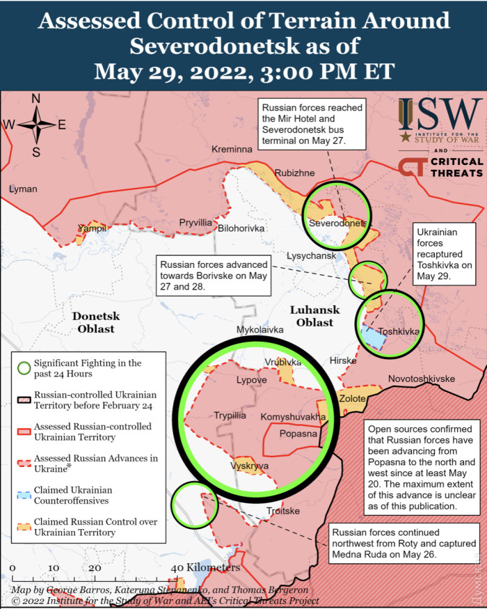 96 дней Украинского Сопротивления: оборона Северодонецка, кровавые «качели» в степях и новый обстрел Одесской областиИдут 96-е сутки героического сопротивления украинского народа полномасштабному вторжению нацистской россии. Основные события войны разворачиваются по-прежнему на Донбассе, где враг не оставляет попыток выйти на административные границы хотя бы одной Луганской области. Однако пока что получается у него не очень. Наступление российских группировок откровенно буксует, а местами Силы обороны Украины наносят точечные, но весьма болезненные контрудары и улучшают свое тактическое положение, как выражаются военные. Однако не стоит и впадать в «переможную» эйфорию: враг еще очень и очень силен, явно превосходит нас по количеству техники и боеприпасов, и способен основательно попортить кровь Украине. Собственно, этим он постоянно и занимается. Северодонецк вчера отмечал 88-ю годовщину со дня своего основания. Город строился вокруг химического комбината, который был заложен в 1934 году. В 1950 году заводской поселок получил нынешнее имя, а в 1958-м – статус города. В 2014 году несколько месяцев провел в российской оккупации, но был освобожден 22 июля подразделениями Национальной гвардии – гвардейцы и сейчас составляют костяк защитников города. В сентябре того же года стал временным областным центром Луганщины. Сегодня этому населенному пункту, в котором в 2019 году проживало чуть больше 100 тысяч человек, снова угрожает захват. Враг постоянно штурмует город. На днях сумел закрепиться на северно-восточной окраине – в гостинице «Мир». К сожалению, выбить его не удалось, и в последние дни оккупанты начали продвигаться к центру города. Со страшными потерями, но тем не менее… А еще Северодонецк подвергается массированным артиллерийским и авиационным ударам, разрушено огромное количество жилых домов (по оценке областной военной администрации – до 60%), промышленность, инфраструктура Нет воды, электроэнергии, связи. Однако защитники города держатся. Очень важно, что российским нацистам так и не удалось полностью окружить украинскую группировку, которая обороняется в Северодонецко-Лисичанской агломерации. Все попытки оседлать трассу на Бахмут закончились провалом. Более того, позавчера Силы обороны отбросили россиян от нее сразу на два километра. Нам сообщают, что освобождены села Камышеваха и Врубовка (но бои там все еще ведутся). Это создает серьезную угрозу правому флангу попаснянской группировки противника, которая, к сожалению, продолжает наступать западнее, в районе Бахмута. «Дорога жизни», хоть и периодически обстреливается (сегодня под вражеский огонь попал эвакуационный транспорт, погиб французский журналист), находится под контролем украинских защитников, по ней не без труда, но перебрасывают грузы и подкрепления. А значит, шансы на то, что Действующей Армии удастся удержать агломерацию, довольно высоки, хотя и 100%-ми мы бы их не назвали. Вообще, наверное, стоило бы все же отвести оттуда войска, как бы ни было психологически тяжело сдавать такие крупные населенные пункты. Но командование, видимо, решило иначе. И не нам его судить. Не очень хорошо на лиманском направлении. Украинские войска все же вышли из Лимана после сильнейших огневых ударов со стороны противника. Пока не очень понятно, сумели ли они закрепиться вбли