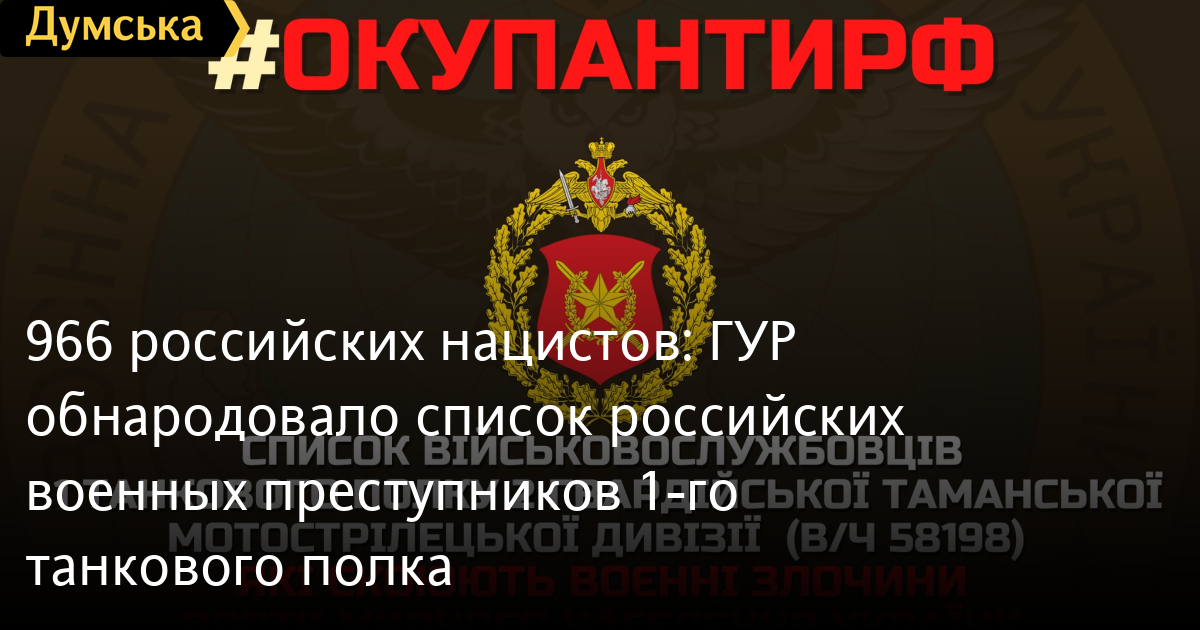 Списки российских военных преступников 1-го танкового полка, участвующих в совершении военных преступлений против Украины, обнародовало Главное управление разведки Минобороны Украины.