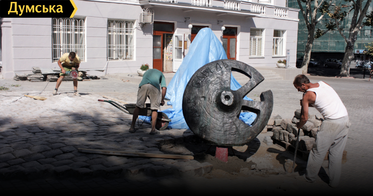Сегодня днем на углу ул. Жуковского и Ришельевской на специально подготовленной площадке у школы №117 рабочие установили изготовленный в Москве бронзовый памятник Исааку Бабелю. Торжественное открытие состоится в всоскресенье, 4 сентября.