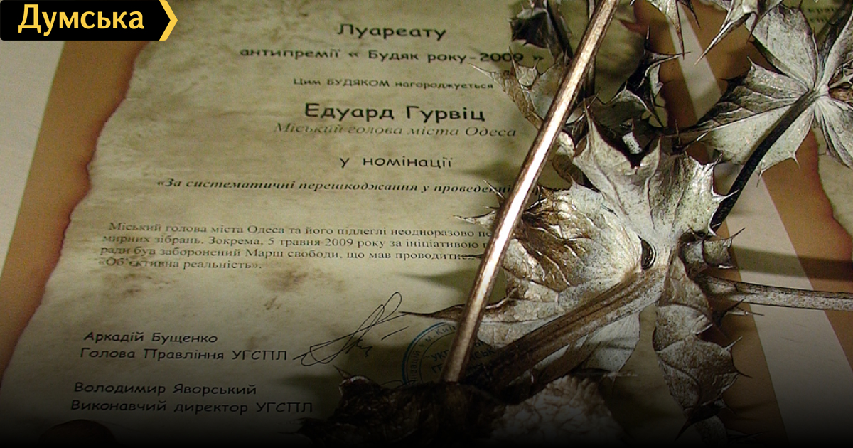 10 декабря в Киеве, в Информационном агентстве УНИАН, состоялась пресс-конференция Украинского Хельсинского союза по правам человека, на которой были названы лауреаты традиционной правозащитной антипремии «Будяк року» (Чертополох года»). Этой антипремией ежегодно награждаются должностные лица и организации, совершившие в текущем году наиболее злостные нарушения прав человека. Одним из лауреатов антипремии стал Одесский городской голова Эдуард Гурвиц — «За систематическое нарушение права граждан на мирные собрания». Общественная организация «Качество жизни», подавшая кандидатуры претендентов на эту номинацию, намеренно не включала Эдуарда Гурвица в число номинантов — фигурантами заявки стали исполнители правонарушения, в частности Наталья Чайчук, которая, пребывая до недавнего времени в должности начальника департамента внутренней политики Одесского горсовета, неоднократно превышала свои служебные полномочия, присваивая себе право судить о законности либо незаконности мирных собраний граждан, что по закону является исключительной компетенцией суда. (На контроле УХСПЧ находится несколько судебных дел, безосновательно инициированных Одесской мэрией — в частности, отмена судом акции против наркомафии, анонсированной ОО «Объективная реальность» — Одесса стала единственным городом, где акция была признана правонарушением еще до ее проведения). Основным же поводом для номинации стало беспрецедентное судебное дело, возбужденное против активиста «Качества жизни», депутата горсовета Михаила Шмушковича, которого одесские суды дважды признавали правонарушителем за организацию мирных собраний. Это дело находится на контроле УХСПЧ как относящееся к категории стратегических. В настоящий момент готовится представление документов по нему в Европейский суд по правам человека. Полностью текст заявки вы можете прочитать на сайте УХСПЧ . Жюри, рассмотрев заявку и приложенные к ней документы, усмотрело в правонарушении четкую линию взаимодействия руководства исполкома, милиции и судов, направленную на ограничение прав гражданина. Ответственным за организацию такой системы, по мнению жюри, является городской голова Эдуард Гурвиц, который и стал основным номинантом в категории «Нарушение прав на мирные собрания». 17 заявок на награждение антипремией, которые поступили от граждан и общественных организаций, рассмотрело жюри, в которое вошли известные люди из разных городов Украины: Егор СОБОЛЕВ, журналист, руководитель независимого бюро журналистских расследований «Свідомо», г. Киев Алла ТЮТЮННИК, президент Херсонского областного Фонда милосердия и здоровья, писатель, журналист, эксперт и тренер по правам человека, г. Херсон Владимир ПОНОМАРЕНКО, Председатель общества потребителей и налогоплательщиков «Гідність», Председатель правления областного отделения Комитета избирателей Украины, Сумская область Владимир ЧЕМЕРИС, Председатель общественной организации «Институт Республика», г. Киев Тарас ВОЗНЯК, политолог, философ, советник губернатора Львовской области, главный редактор независимого журнала «Ї», г. Львов Аркадий БУЩЕНКО, Председатель Правления УХСПЧ, эксперт Харьковской правозащитной группы, г. Харьков Также лауреатами антипремии стали: - Верховный суд Украины — в номинации «За открытое пренебр