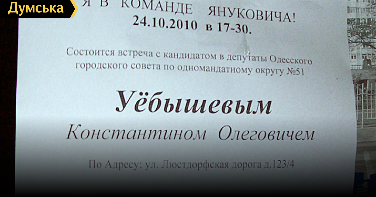Господа Одесситы!!! Ведь этот сайт для нас или для быдла типа тех кто пишет такие «замечательные»и «благовоспитанные» листовки! Если конкуренты оскорбляют и унижают нормального воспитанного, состоявшегося в жизни человека- Улыбышева Константина, то это ДНО!!! Они не имеют права не то что лезть во власть нашего города, а дышать нашим одесским воздухом. Древенщина
