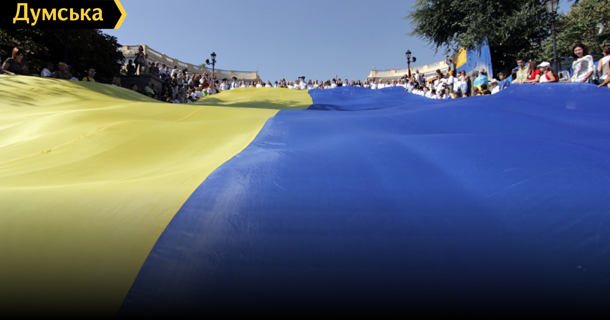 Сегодня, в День государственного флага Украины над Потемкинской лестницей Одессы пронесли гигантский желто-голубой стяг длиной в 20 метров. Эта традиция, где каждый метр символизирует один год независимости, была заложена в 2009 году.