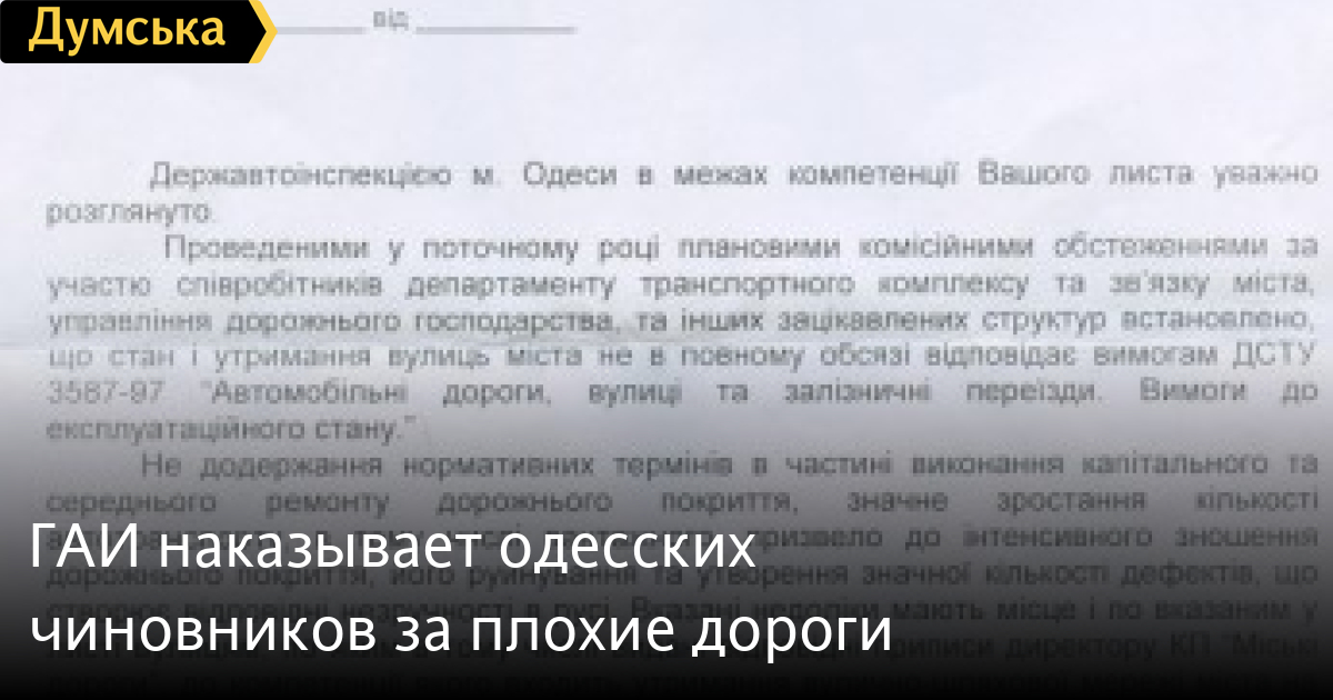 Кроме того, как отмечает 4road.net, в письме, подписанном зам.начальника УГАИ г. Одессы, В.В. Кузнецовым, указывается причина плачевного состояния дорог нашего города: « Несоблюдение нормативных документов в части выполнения капитального и текущего ремонта дорожного покрытия, значительное увеличение автотранспорта, в т.ч. грузового »