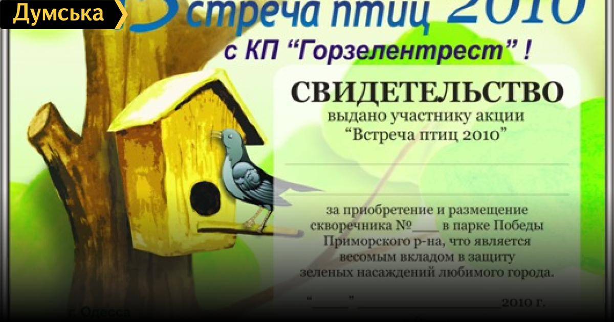 27-28 марта 2010 года с 10.00 КП «Горзелентрест» проводит во всех районах города акцию «Встреча птиц-2010», сообщает муниципальное управление информации. КП «Горзелентрест» приглашает учащихся школ, лицеев, гимназий, студентов и всех одесситов в парки города: Парк им. М.Горького. Место сбора — напротив кинотеатра «Москва». Участники акции смогут приобрести скворечники с именными сертификатами, которые будут развешены на деревья. СМЕРТЬ РОСІЙСЬКИМ ОКУПАНТАМ! Помітили помилку? Виділяйте слова з помилкою та натискайте control-enter Новини по цій темі: 27 березня 2024: На Канатній обрізають гілки: рух вулицею обмежено (фото) 5 січня 2024: Просіла місцями на 20 сантиметрів: що відбувається з плиткою в одеському Міському саду? 24 листопада 2023: Вимагав хабар, щоб не звільняти підлеглого: чиновнику одеського "Міськзелентресту" повідомили про підозру 11 листопада 2023: Негода в Одесі: стихія повалила 15 дерев і великих гілок (фото) |