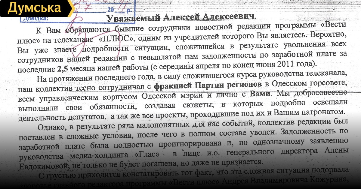 Обращаемся к Вам, как к человеку, хорошо знающему каждого из нас по нашей совместной работе с Вами и фракцией Партии регионов, оказать содействие в восстановлении справедливости и выплаты нам зарплаты за отработанный период», — говорится в обращении журналистов.