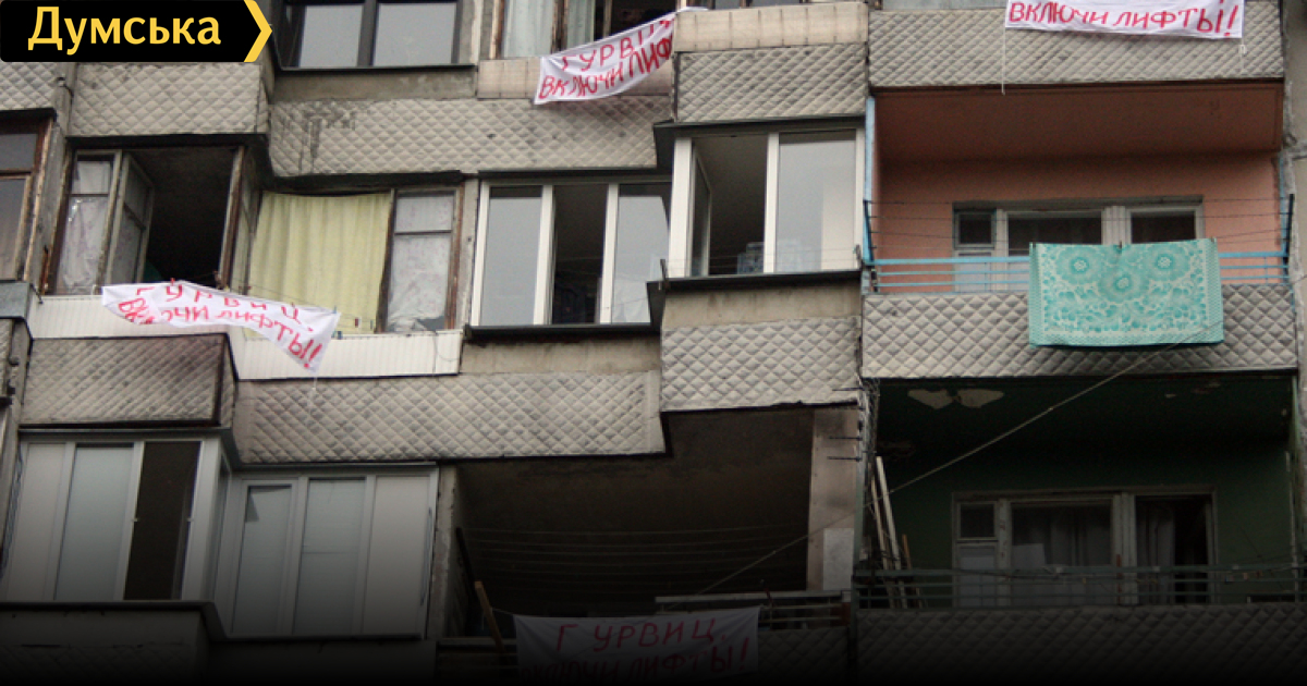 На фото 9-этажный дом и то люди не выдержали. А ведь на М.Жукова без лифтов стоят и 16-этажные дома. Представляете, подниматься пешком на 16 этаж каждый день. Гурвицу это не понять, ведь он выше двух ступенек ногу не поднимает.