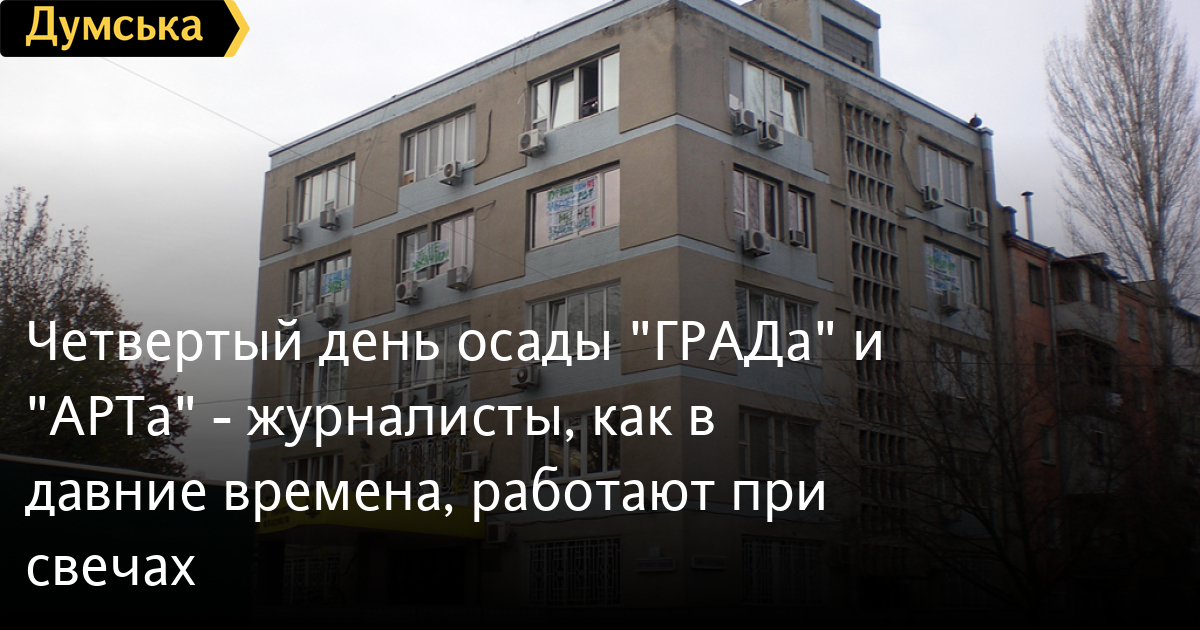 Наш корреспондент только что побывал в здании на Артиллерийской,1, где находятся в заложниках городской власти три оппозиционных ей телевизионных канала — «АРТ», «АРТ-24» и «ГРАД» и несколько радиостанций. У них по-прежнему отключен свет, а в эфир они выходят с помощью дизельного генератора.