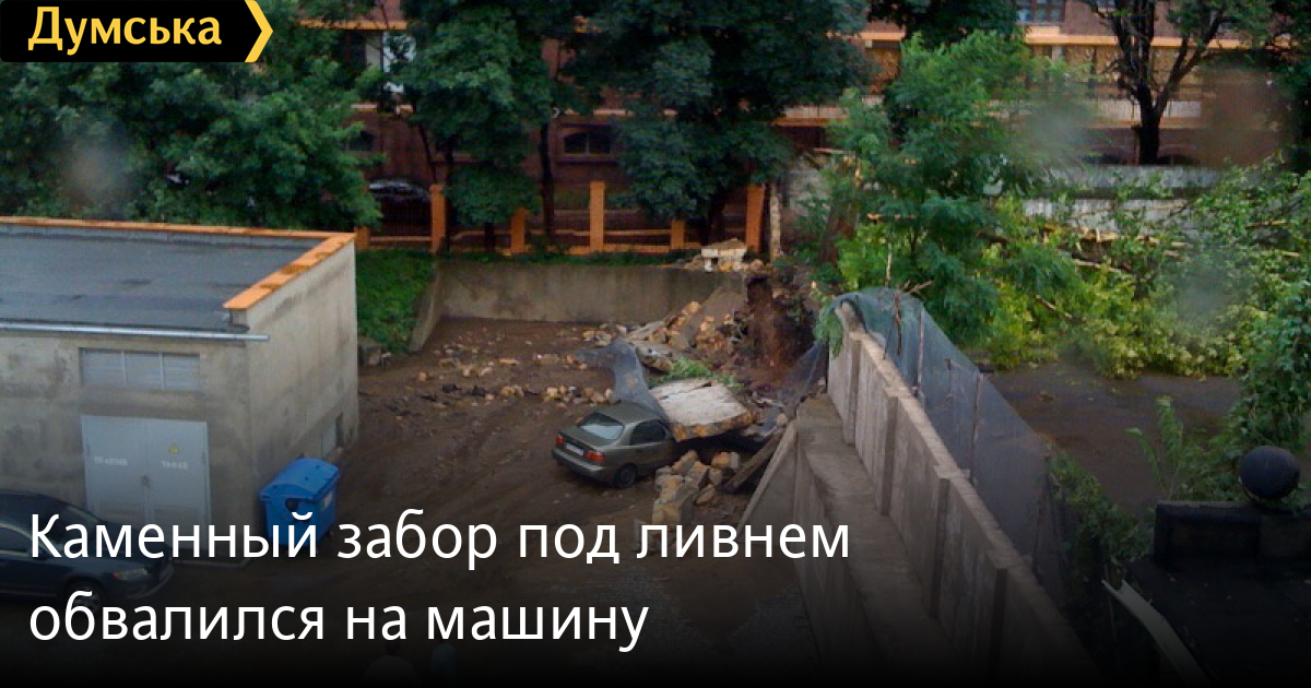 Во время ливня обвалилось дерево, а от потоков воды обвалилась часть каменного забора на улице Генуэзской. Пострадал припаркованный под забором автомобиль. Пострадавших нет.