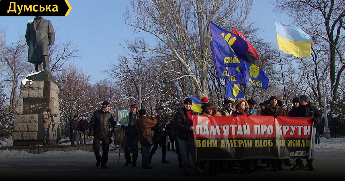 Сегодняшняя акция была приурочена к очередной годовщине Боя под Крутами, произошедшего 29 января 1918 г. Тогда, согласно официальной украинской историографии, 50 киевских юнкеров, студентов и гимназистов из Студенческого куреня, а также 100 гайдамаков и вольных казаков и 12 конных казаков под командованием сотника Лощенко заняли оборону железнодорожной станции Круты, чтобы предотвратить наступление на Киев большевистских войск Советской России под командованием Михаила Муравьева.