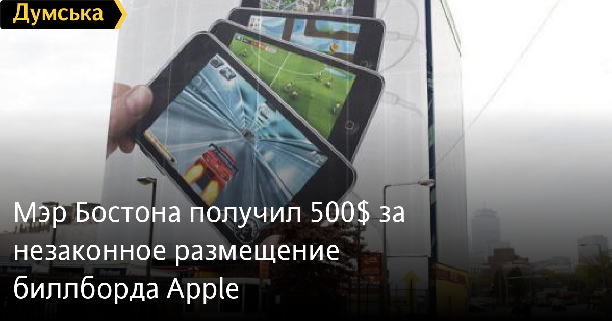 Корпорация Apple разместила в Бостоне гигантский рекламный щит, рекламирующий музыкальные плееры iPod Touch. Размещение рекламного баннера площадью 1277 квардратных метра, занявшего всю стену здания в центре Бостона, было признано незаконным Комиссией по Наружной Рекламе штата Массачусетс ещё осенью 2007 года. Издание «The Boston Globe» сообщает, что корпорация договорилась с властями штата о компенсации за такое нарушение в размере 110 тысяч долларов. В статье предполагается, что такое соглашение было достигнуто «с некоторой помощью». Так по данным издания активные усилия в урегулировании конфликта оказывал мэр Бостона Томас Менино за что корпорация ежегодно перечисляла на его личный счёт максимально допустимое американскими законами пожертвование в размере 500$. ![]() Тот самый злополучный гигантский рекламный щит Во всех остальных случаях городская администрация отказывала в размещении новых биллбордов. Временное разрешение на размещение этой огромной рекламый закончилось ещё прошлой осенью, однако рекламодатели не спешили продлевать его вплоть до июня этого года, когда они выплатили компенсацию комиссии по наружной рекламе штата. Всё это время мэр закрывал глаза на гигантский баннер. Томасу Менино 66 лет. Он является мэром Бостона с 1993 года. СМЕРТЬ РОССИЙСКИМ ОККУПАНТАМ! ![]() Мэр Бостона Томас Менино (справа) Заметили ошибку? Выделяйте слова с ошибкой и нажимайте control-enter |